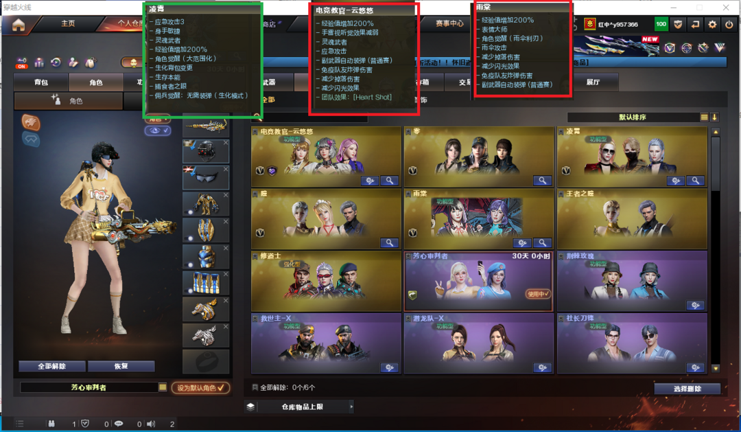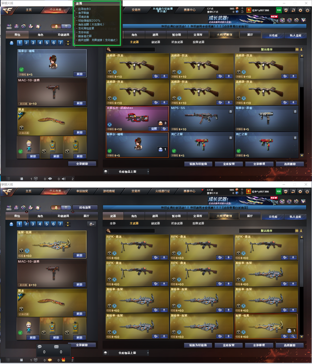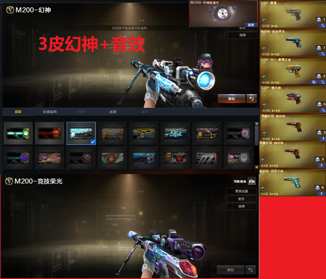 装备描述:排位:可以------------爆破四防:幻神3皮+音效(23白鲨、青鹤、丹凤皮肤)、M200-竞技荣光、USP雷暴、COP堕天神、柯尔特竞技荣光、2个世冠柯尔特、COP雷霆王者、冠军之特、传说梦魇、G36幻影、白虎、QBZ金色蔷薇、、、爆破四防(云悠悠、凌霄、雨棠)