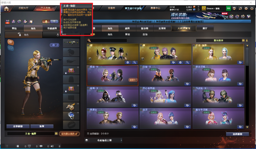 装备描述:排位:可以、、、、、、、、、、、、爆破四防:幻神3皮(周瑜、星耀、电流骇客皮肤)、王者风神、、、、、、USP冥王、USP雷暴王者、2个冠军之特、柯尔特竞技荣光、COP极地霜雄、、、、、、G36幻影、FAMAS G2-天戎、白虎、QBZ金色蔷薇、2把炽芒蝶刃、、、幻影音效、白虎音效、毁灭音效、、、1套竞技荣光、1套神工天巧、1套量子之心、5套雷暴王者、、、、、、爆破四防(王者魅影)