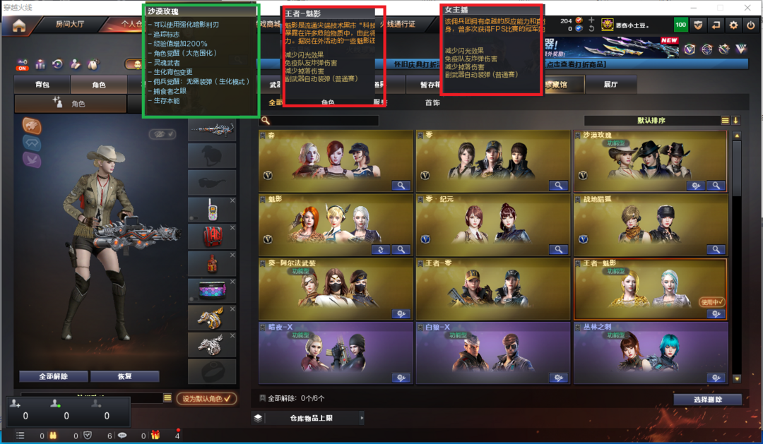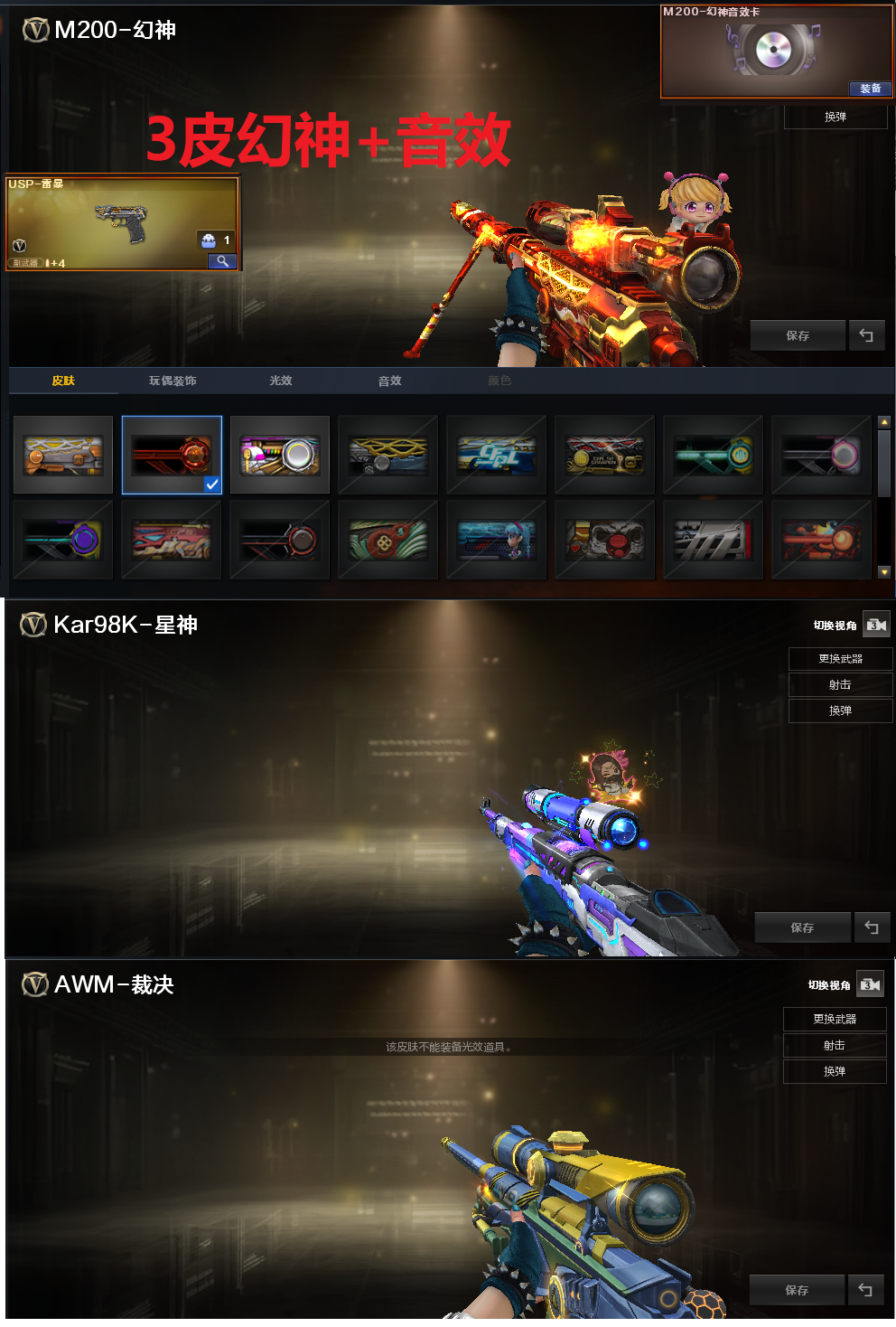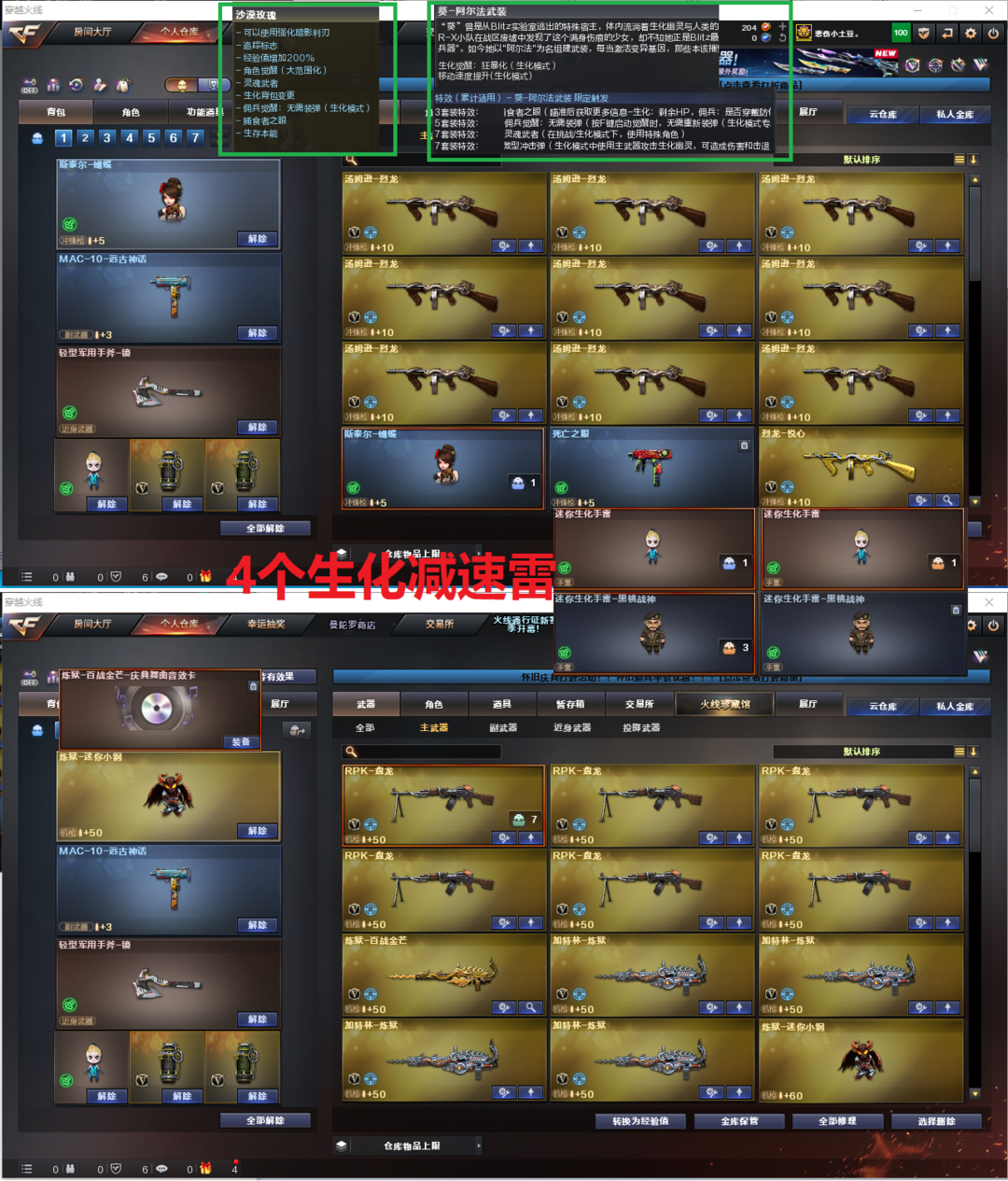 装备描述:排位:可以---------生化四防极品(可以更换生化背包、查看生化僵尸血量):无需换弹、6烈、6盘、炼狱+音效、斯太尔蝴蝶、炼狱小刚、斯泰尔蝴蝶、死亡之眼、MAC-涂鸦、手斧镜、4个生化减速雷、超级对讲机、全部弹匣、、、、、爆破四防:幻神3皮+音效(丹凤、黄忠、动感闪耀皮肤)、98K星神、USP雷暴、QBZ03-独角-V、白虎、QBZ金色蔷薇、、、幻神音效、毁灭音效、雷神音效、火麒麟音效、黑骑士音效、、、生化四防(沙漠玫瑰、葵-阿尔法)爆破四防(王者魅影、女主播)