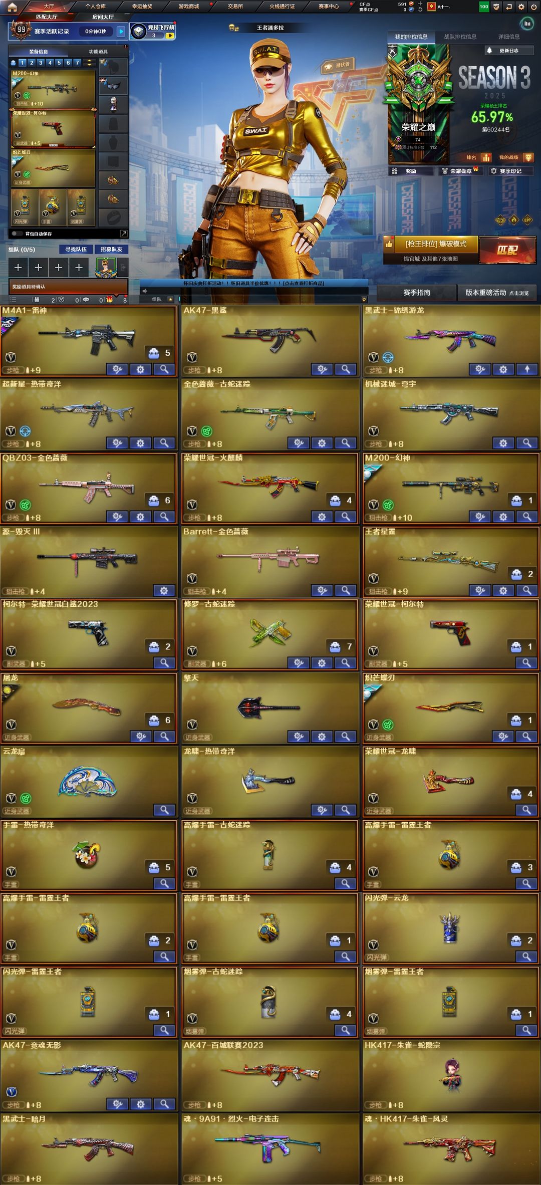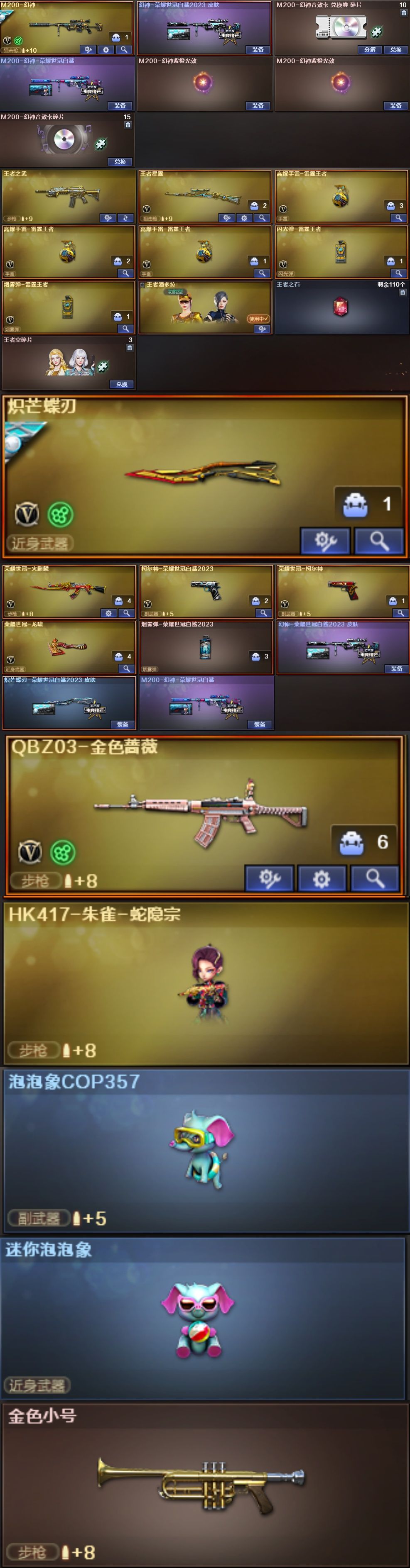 装备描述:【幻神双皮号】【m200幻神+荣耀世冠白鲨皮肤+荣耀世冠白鲨2023皮肤】【觉醒王者星霆】【炽芒蝶刃+荣耀世冠白鲨2023皮肤】【qbz金色蔷薇】【cop泡泡象/迷你泡泡象/金色小号/HK朱雀蛇隐宗】【荣耀世冠柯尔特】【荣耀世冠白鲨柯尔特2023】【荣耀世冠火麒麟/荣耀世冠龙啸】【王者之武】【雷神+白鲨CFpls14冠军皮肤/雷神化蛇皮肤/雷神暗月皮肤】【AK黑鲨/黑武士锦绣游龙/超新星热带奇洋/金色蔷薇古蛇迷踪/机械迷城穹宇/巴雷特金色蔷薇】【荣耀世冠柯尔特/荣耀世冠白鲨2023柯尔特/修罗古蛇迷踪】【炽芒蝶刃/屠龙/擎天/荣耀世冠龙啸/龙啸热带奇洋/云龙扇】【雷霆王者手雷包】【王者潘多拉/蛇隐宗/奇洋探员】【齐天大圣/夜玫瑰宠粉/雪莉杨摸金校尉/斯沃特锋芒精英/猎狐者追月/兰妹妹/电竞少女/电光少女/0号玩家/游珑儿】【潘多拉-x/飞狐-x/灵狐者-x/曼陀罗-x】【永久烟雾头护目镜】【bs战队炫彩背包/古蛇迷踪炫彩背包/热带奇洋炫彩背包/超级背包】【幻神荣耀世冠白鲨皮肤/幻神荣耀世冠白鲨2023皮肤】【炽芒蝶刃荣耀世冠白鲨2023皮肤】【屠龙星火燎原皮肤】【毁灭秦师皮肤/毁灭虹光