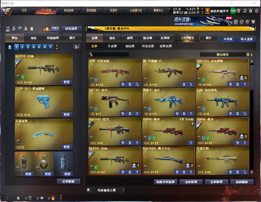 装备描述:王者武器:闪光弹-王者堕天神;烟雾弹-雷暴王者;闪光弹-雷暴王者;高爆手雷-雷暴王者;USP-雷暴王者;斩神刀-雷暴王者;王者之怒-觉醒版;王者之啸-觉醒版;王者冰锋;炼狱-悦蓝-觉醒版 英雄武器:幻神 ,雷霆之契;扳手-量子之心;Anaconda-量子之心;Kar98K-量子之心;M4A1-雷神;屠龙;Scar Light-白虎;柯尔特-冠军之特;Barrett-毁灭;QBZ03-金色蔷薇;QBZ03-金色蔷薇;M4A1-千变;白虎-电玩蓝兔;HK417-朱雀;闪光弹-玄豹;烟雾弹-玄豹;高爆手雷-玄豹;沙鹰-修罗;M4A1-黑骑士;USP-冥王;传说圣谕;AA-12-雷霆;AWM-裁决;9A91-烈火;机械迷城-穹宇;M4A1-雷神;高爆手雷-竞技荣光;闪光弹-竞技荣光;烟雾弹-竞技荣光;擎天;龙啸-热带奇洋;手雷-热带奇洋;黑武士-锦绣游龙;黑骑士-海王;无影-神兵利器;AK47-火麒麟 角色:雨棠;电竞教官-云悠悠;智;猎狐者;飞虎队;刀锋;潘多拉;复仇者;堕天使;活力灵狐;夜玫瑰;威锋;陈龙野;娜塔莎;精英部队;灵狐者;烈锋;灵狐者-黄金海岸;影武者-