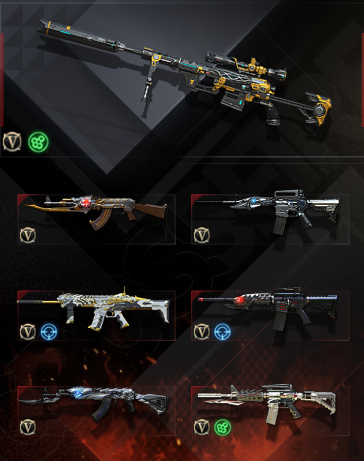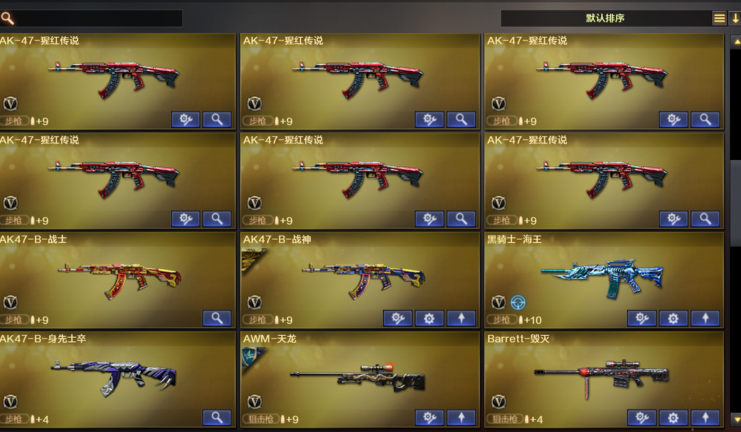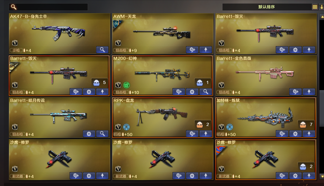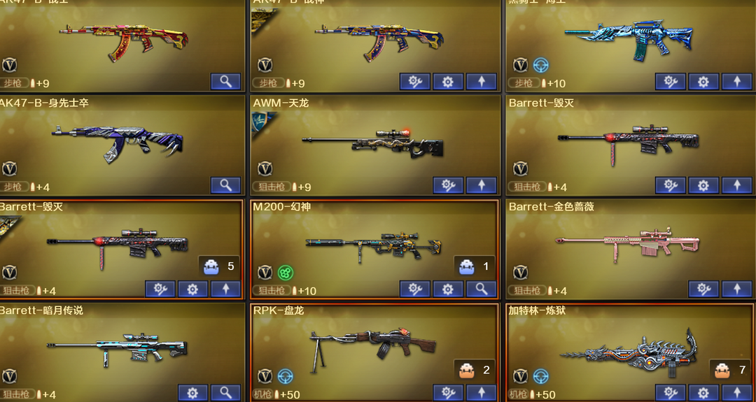 装备描述:王者武器:王者之势-觉醒版;王者之光;炫金天龙;王者之武 英雄武器:烟雾弹-竞技荣光;沙鹰-修罗;天神-动感闪耀;手雷-动感闪耀;AK47-B-身先士卒;QBZ03-金色蔷薇;黑骑士-海王;Scar Light-白虎;M4A1-黑骑士;RPK-盘龙;加特林-炼狱;M200-幻神;M4A1-黑龙;AK-47-猩红传说;Barrett-毁灭;Barrett-暗月传说;AK47-B-战神;AK47-B-战士;AK47-黑武士;M4A1-玫瑰精灵;AK47-火麒麟;M4A1-龙血;龙啸;雷霆之锋;高爆手雷-雷霆;烟雾弹-雷霆;闪光弹-雷霆;沙鹰-天神;屠龙;M4A1-雷神;麒麟刺;AWM-天龙;AK47-无影;M4A1-死神;擎天