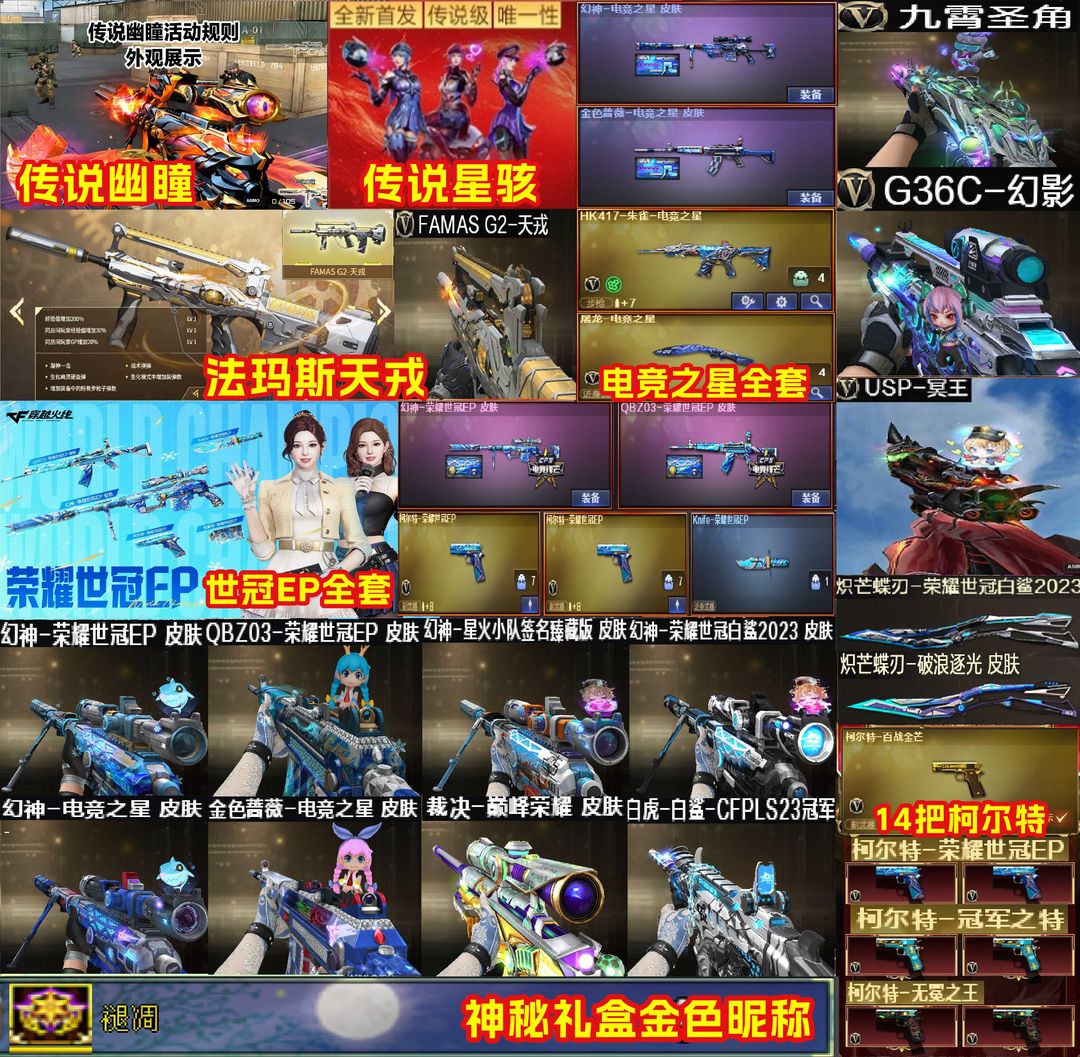 限制: 租号5次及以上 |装备描述:【装备道具】:全新荣耀EP套装妮妮,两套黄金套(次元+金狐),满Buff,6致命一击2,角斗场榜60,剩100多张五星卡,四星卡800左右,6黑搭配7无尽模式攻击力玩偶,轻松50关,爆破全装,各类热门武器均带质量皮,4防角色8个左右,生化小毕业,九霄圣角满级,带金色字体❤幻神-荣耀世冠EP/幻神-电竞之星/幻神-电流骇客/幻神-星火小队签名臻藏版/幻神-荣耀世冠白鲨2023/幻神-CFS2022/幻神-星耀/星神-枪娘默/毁灭-定军扬威/幻影-破浪逐光/金色蔷薇-电竞之星/金色蔷薇-破浪逐光/白虎-白鲨-CFPLS23冠军/Scar 白虎-暗星/QBZ03-荣耀世冠EP/世冠白鲨炽芒蝶刃-破浪逐光❤幻神音效卡/星神音效卡/白虎音效卡/裁决音效卡/极光音效卡/❤传说星骇/妮妮❤传说幽瞳/传说幽冥3把❤竞技荣光套装/王者玄武/王者霜心/VSK-94-金蚀/王者风神-觉醒版/炼狱-百战金芒/柯尔特-荣耀世冠EP(2)/柯尔特-百战金芒/USP-冥王/柯尔特-荣耀世冠白鲨2023/柯尔特-无冕之王(2)/屠龙-电竞之星❤G36C-幻影/QBZ-银翼游侠/FAMAS G2-天戎/全音效卡6烈6盘