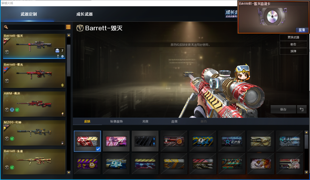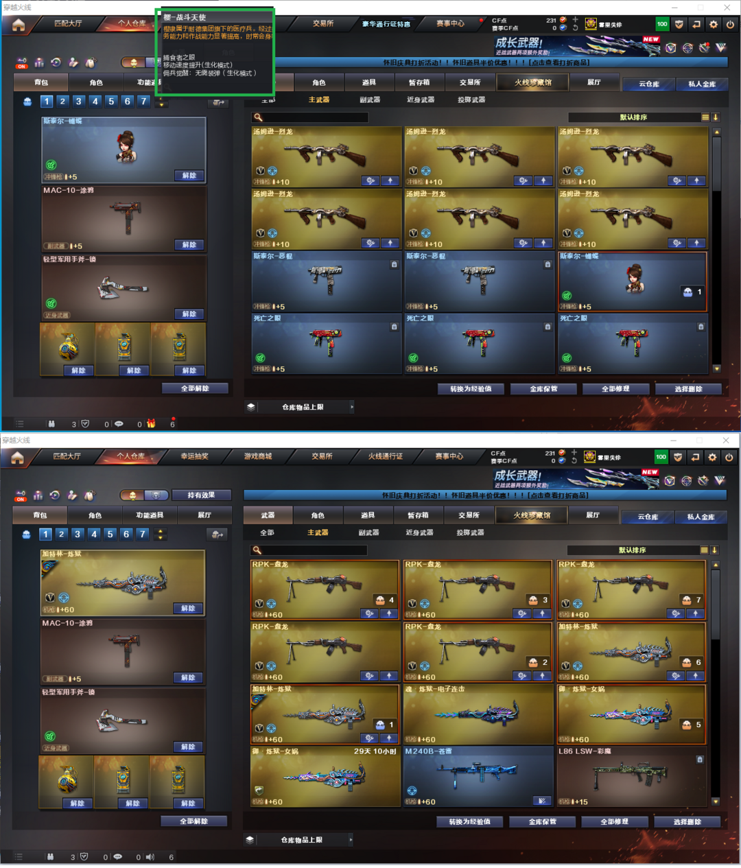 装备描述:排位:可以、、、、、、、、、、爆破全装:幻神(AG皮肤)、世冠柯尔特、传说辉光、白虎、QBZ金色蔷薇、世冠火麒麟、、、蔷薇音效、毁灭音效、雷神音效、火麒麟音效、黑骑士音效、、、1套雷暴、1套幻灵、4套雷霆王者、、、生化人物(樱-战斗天使)