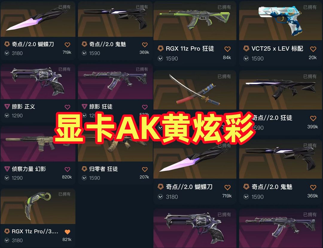可排✅显卡1.0狂徒⚡掠夺⚡显卡爪刀⚡般若太刀⚡奇点2.0⚡侦察幻影⚡归零者狂徒⚡VCT25标配