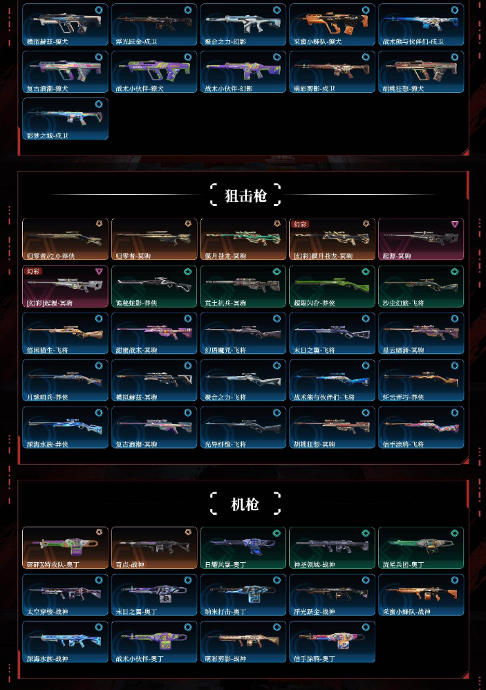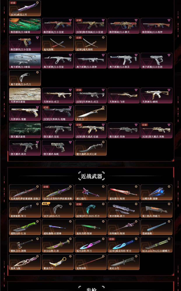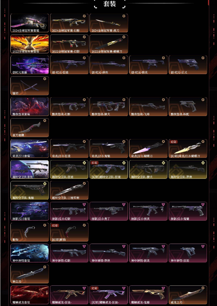 装备描述:悲悯之刃掠影2.0超时空卫队2022全球2024全球黯夜怪谈创纪元奇点2.0神中神罚耀鳞威龙般若假面2.0离子武器2.0天界神兵堕天遗武vct爪刀超限闪存匕首沙尘幻旅匕首弧光异彩落英飞旋紫金爪刀剥皮小刀光荣异象狂徒显卡狂徒电音光谱幻影光明哨兵狂徒混沌序曲狂徒双城之战狂徒千灵华绽幻影洪荒怒焰狂徒塑水宗狂徒全息波普2.0坤阿根廷机动狂飙狂徒归零者狂徒归零者撩犬偃月苍龙狂徒奇点幻影上古龙炎狂徒艾莉沃的梦之翼狂徒天界神兵2.0幻影紫阙金琅狂徒盖亚的复仇狂徒侦察力量幻影冰点凝结狂徒海洋之星狂徒日冕雄狮狂徒掠影狂徒归零者2.0莽侠归零者冥驹偃月苍龙冥驹起源冥驹砰砰特工队奥丁奇点战神奇点骇灵紫阙金琅骇灵偃月苍龙判官电音光谱标配西部未来正义千灵华绽正义塑水宗正义奇点正义紫阙金琅标配离子武器正义
