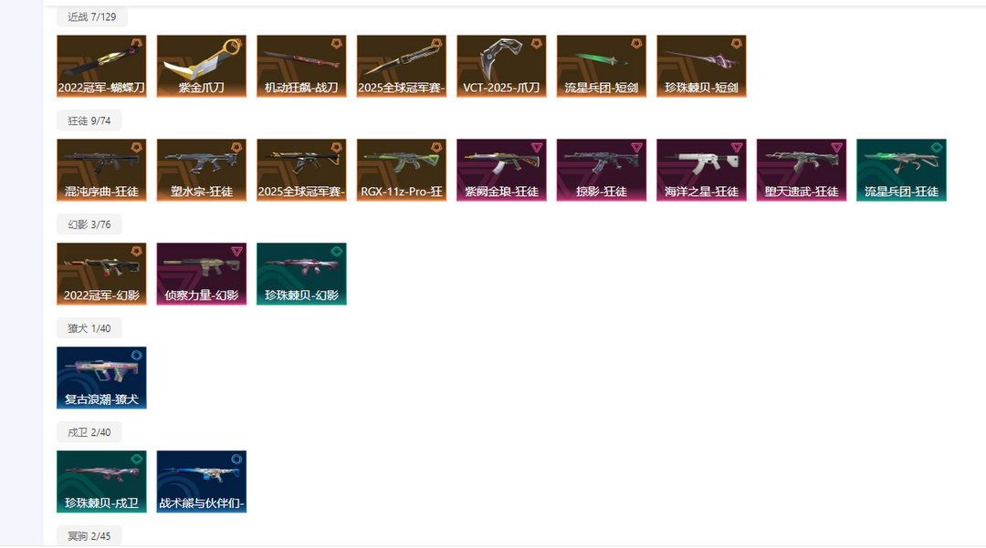 装备描述:【拥有套装】2022全球冠军赛套装(2022全球冠军赛-幻影,2022全球冠军赛-蝴蝶刀)2025全球冠军赛套装(2025全球冠军赛-狂徒,2025全球冠军赛-蝴蝶刀 ) 【拥有近战武器】VCT-2025-爪刀,流星兵团-短剑,珍珠棘贝-短剑,机动狂飙-战刀,紫金爪刀, 【拥有步枪】RGX-11z-Pro-狂徒,混沌序曲-狂徒,塑水宗-狂徒,堕天遗武-狂徒,紫阙金琅-狂徒,侦察力量-幻影,海洋之星-狂徒,掠影-狂徒,流星兵团-狂徒,珍珠棘贝-戍卫,珍珠棘贝-幻影,战术熊与伙伴们-戍卫,复古浪潮-獠犬, 【拥有狙击枪】千灵华绽-冥驹,战术熊与伙伴们-飞将,纤云弄巧-莽侠,复古浪潮-冥驹,深海水族-莽侠, 【拥有机枪】流星兵团-奥丁,深海水族-战神, 【拥有冲锋枪】无限竞技-骇灵,流星兵团-骇灵,珍珠棘贝-骇灵,纤云弄巧-蜂刺,深海水族-蜂刺, 【拥有霰弹枪】复古浪潮-雄鹿, 【拥有手枪】VCT-x-TEC-标配,奇点-正义,星际猎兵-标配,阿特拉斯指挥部-标配,日耀风暴-正义,诡秘蛇影-鬼魅,超限闪存-正义,超能偶像-标配,流星兵团-鬼魅,珍珠棘贝-狂怒,蛇吻-短炮,星云暗涌-鬼魅,纳米