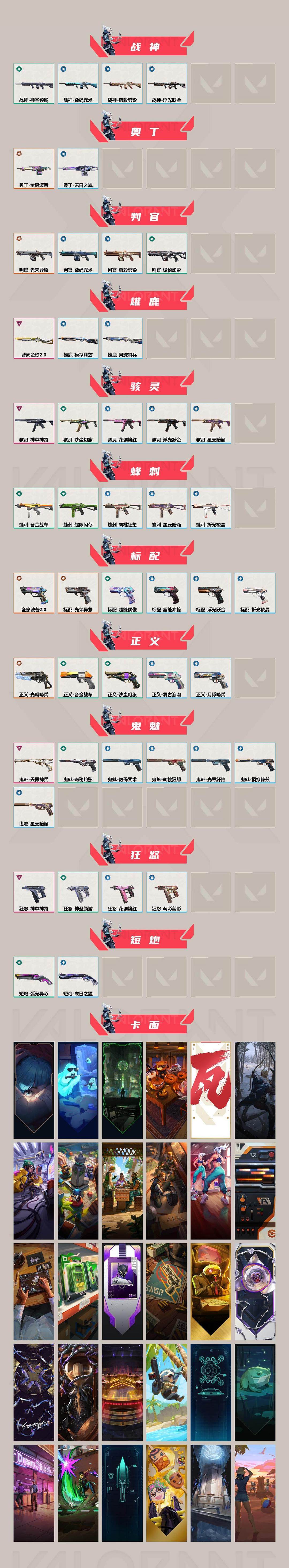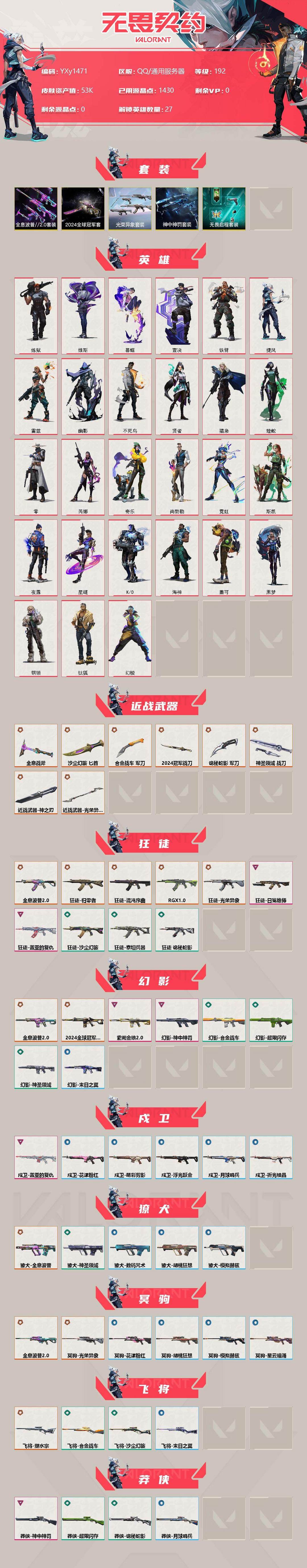 装备描述:【套装】:2024全球冠军赛套装,光荣异象套装,全息波普//2.0套装,神中神罚套装,无畏启程套装 【英雄】:幻棱,炼狱,维斯,暮蝶,钛狐,壹决,铁臂,捷风,雷兹,幽影,不死鸟,贤者,猎枭,蝰蛇,零,芮娜,奇乐,尚勃勒,霓虹,斯凯,夜露,星礈,K/O,海神,盖可,黑梦,钢锁 【近战 武器】:近战武器-2024全球冠军赛 战刀,近战武器-光荣异象 歧途,近战武器-神之刃,近战武器-合金战车 军刀,近战武器-全息战斧,近战武器-沙尘幻旅 匕首,近战武器-诡秘蛇影 军刀,近战武器-神圣领域 战刀 【狂徒】:狂徒-归零者,狂徒-混沌序曲,狂徒-全息波普//2.0,狂徒-RGX 11z Pro,狂徒-光荣异象,狂徒-盖亚的复仇,狂徒-日冕雄师,狂徒-沙尘幻旅,狂徒-泰坦兵器,狂徒-诡秘蛇影 【幻影】:幻影-2024全球冠军赛,幻影-全息波普//2.0,幻影-紫阙金琅//2.0,幻影-神中神罚,幻影-超限闪存,幻影-合金战车,幻影-神圣领域,幻影-末日之翼 【戍卫】:戍卫-盖亚的复仇,戍卫-浮光跃金,戍卫-花漾粉红,戍卫-萌彩剪影,戍卫-月球哨兵,戍卫-折光棱晶 【獠犬】:獠犬-全息波普,獠犬-神
