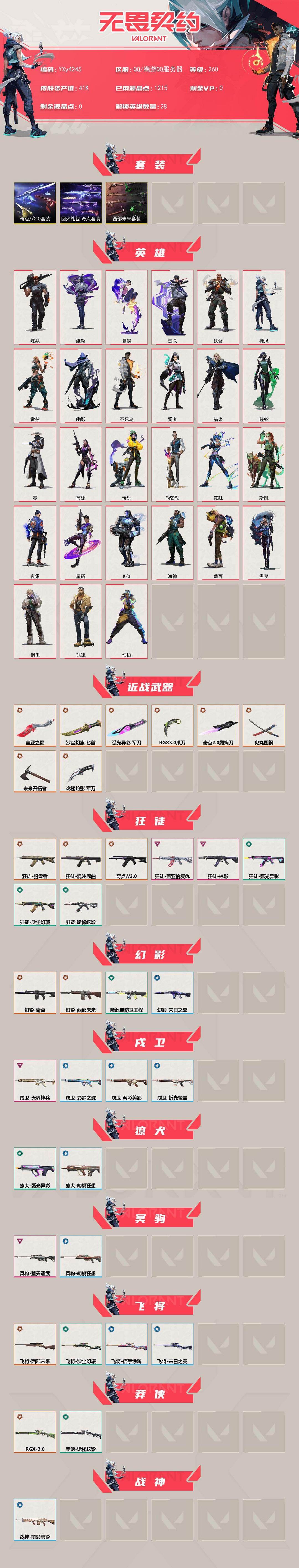 装备描述:冻结三分钟内解除,短信通知重新上即可!喜欢收藏不迷路、游戏异常进小黑屋、时间不够请提前续租或者不要开局 【套装】:西部未来套装,奇点//2.0套装,回火礼包:奇点套装 【英雄】:幻棱,炼狱,维斯,暮蝶,钛狐,壹决,铁臂,捷风,雷兹,幽影,不死鸟,贤者,猎枭,蝰蛇,零,芮娜,奇乐,尚勃勒,霓虹,斯凯,夜露,星礈,K/O,海神,盖可,黑梦,钢锁 【近战武器】:近战武器-奇点//2.0 蝴蝶刀,近战武器-RGX 11z Pro//3.0 爪刀,近战武器-鬼丸国纲,近战武器-未来开拓者,近战武器-盖亚之愠,近战武器-弧光异彩 军刀,近战武器-沙尘幻旅 匕首,近战武器-诡秘蛇影 军刀 【狂徒】:狂徒-归零者,狂徒-混沌序曲,狂徒-奇点//2.0,狂徒-掠影,狂徒-盖亚的复仇,狂徒-弧光异彩,狂徒-沙尘幻旅,狂徒-诡秘蛇影 【幻影】:幻影-奇点,幻影-西部未来,幻影-噬源兽防卫工程,幻影-末日之翼,幻影-西部未来 【戍卫】:戍卫-天界神兵,戍卫-彩梦之城,戍卫-萌彩剪影,戍卫-折光棱晶 【獠犬】:獠犬-弧光异彩,獠犬-胡桃狂想 【冥驹】:冥驹-堕天遗武,冥驹-胡桃狂想 【飞将】:飞将-西部未来,飞