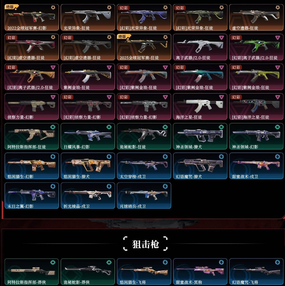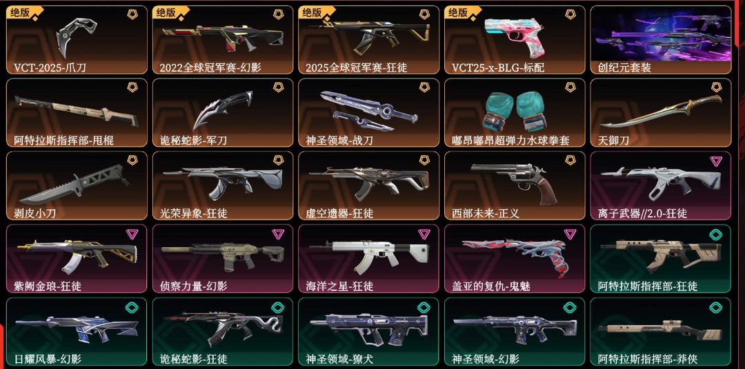 装备描述:可排位✨VCT爪刀/22/25冠军✨创纪元套装✨嘟昂嘟昂拳套/天御刀/剥皮小刀✨异象/虚空/离子/紫金/鱼缸狂徒✨侦查幻影✨西部正义/盖亚鬼魅✨
