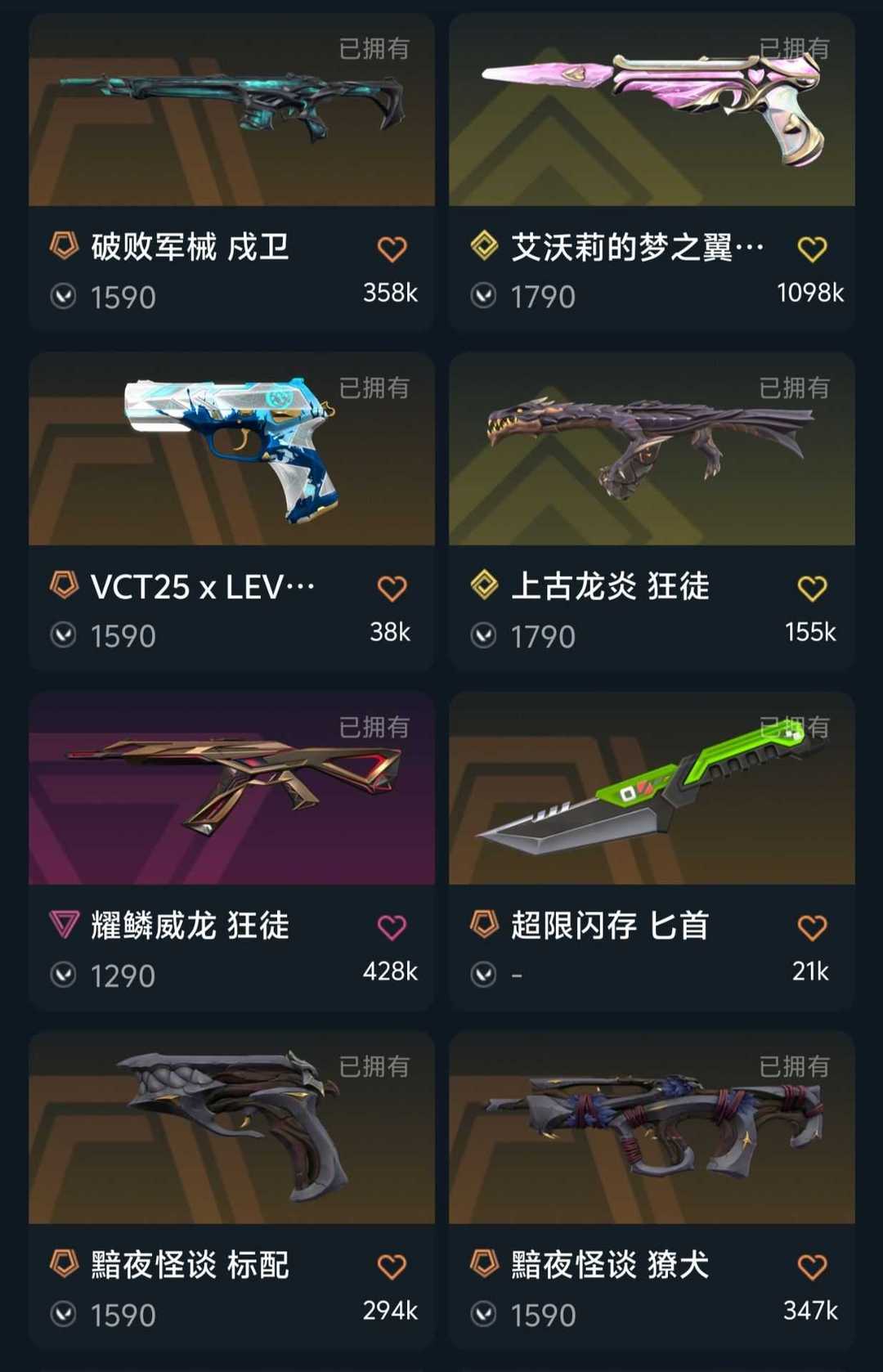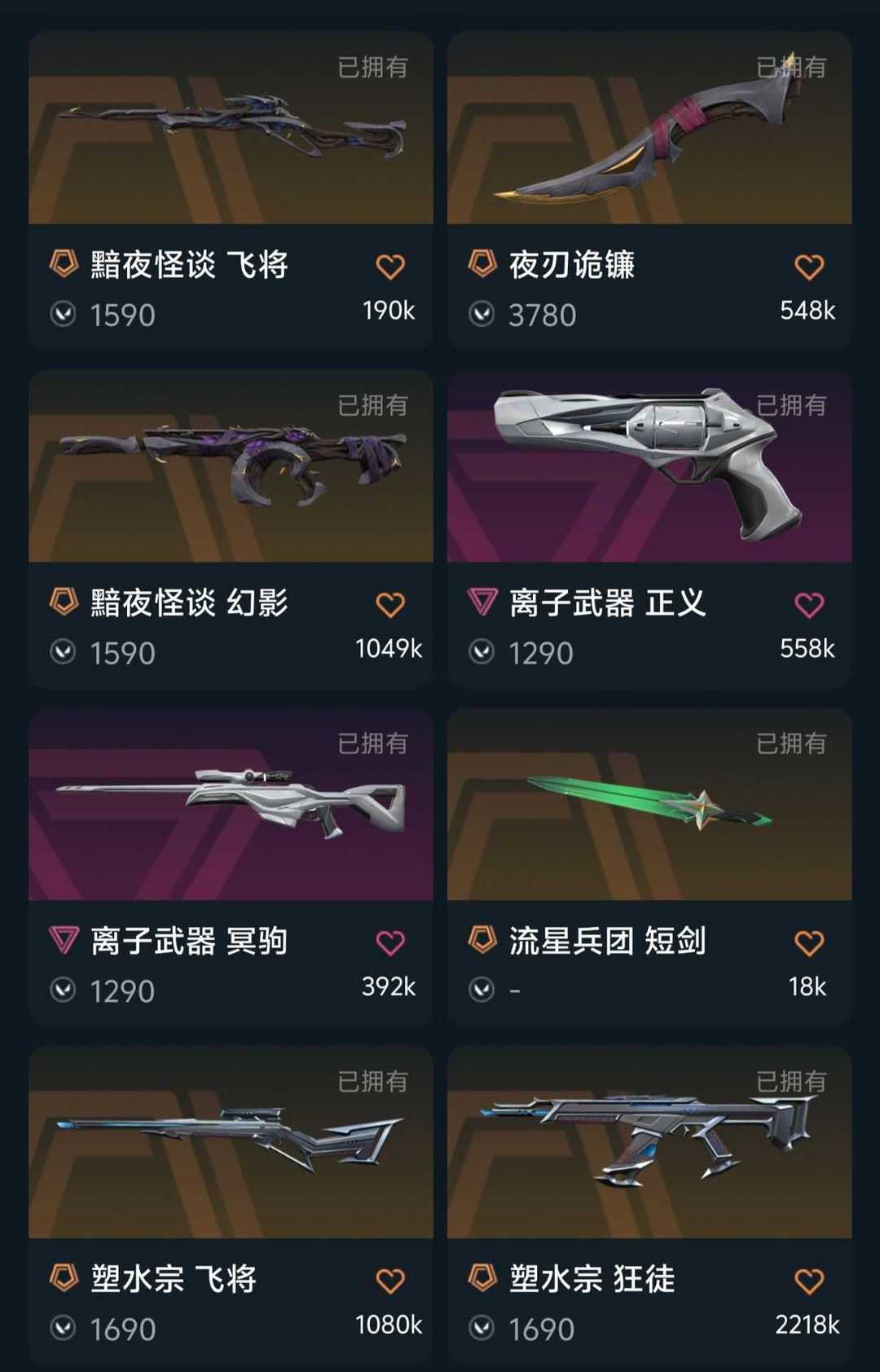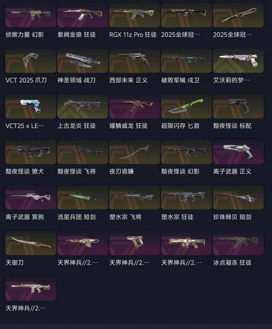 装备描述:【拥有套装】黯夜怪谈套装(黯夜怪谈-幻影,黯夜怪谈-獠犬,黯夜怪谈-飞将,黯夜怪谈-标配,夜刃诡镰)2025全球冠军赛套装(2025全球冠军赛-狂徒,2025全球冠军赛-蝴蝶刀 )天界神兵2.0套装(天界神兵//2.0-幻影,天界神兵//2.0-奥丁,天界神兵//2.0-判官,天界神兵//2.0-狂怒,天御刀) 【拥有近战武器】VCT-2025-爪刀,神圣领域-战刀,超限闪存-匕首,流星兵团-短剑,珍珠棘贝-短剑