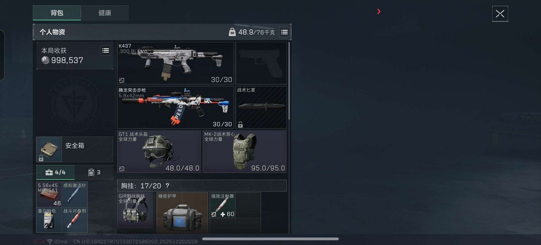 装备描述:仓库总资产36m 哈夫币2682w,一把满改m14,一把满改m7,一个红甲修,特勤处有五甲自取,开挂提id报警