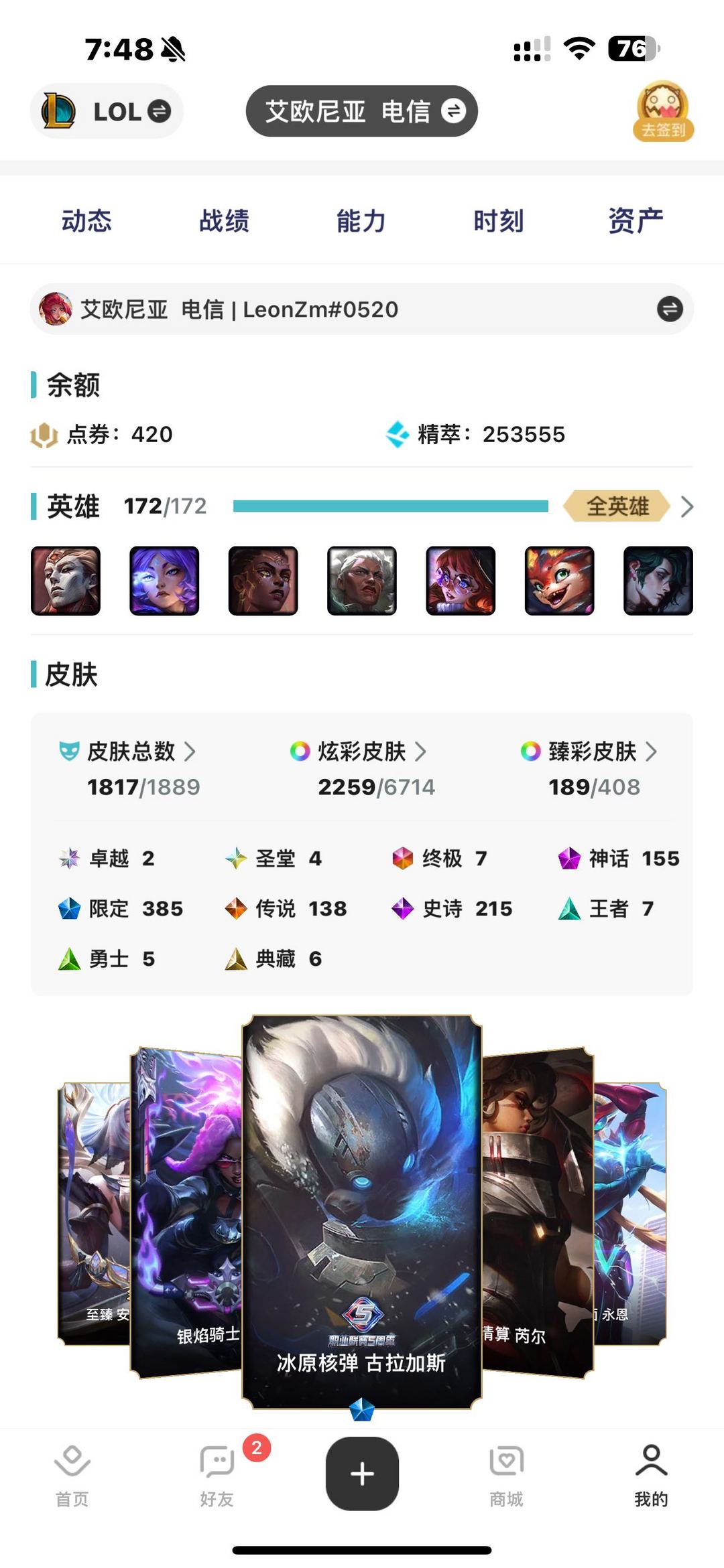 艾欧尼亚 1817皮肤 4圣堂弗耶戈 金克斯189臻彩 名人堂阿狸 名人堂卡莎全有 2242炫彩