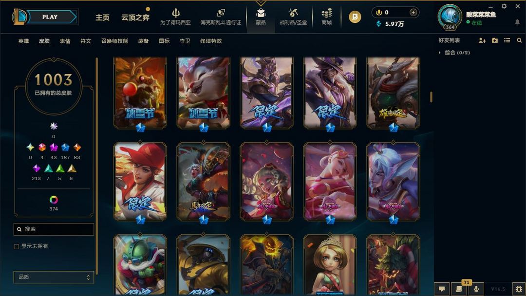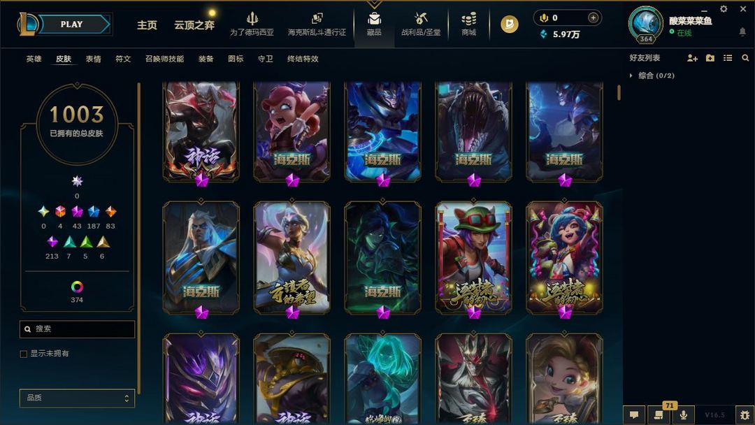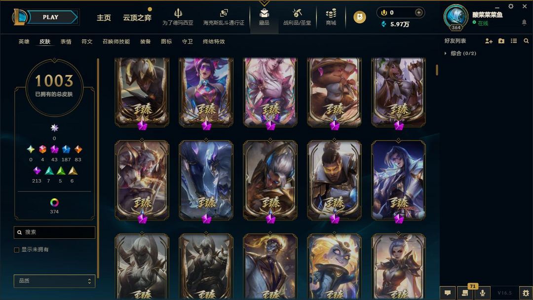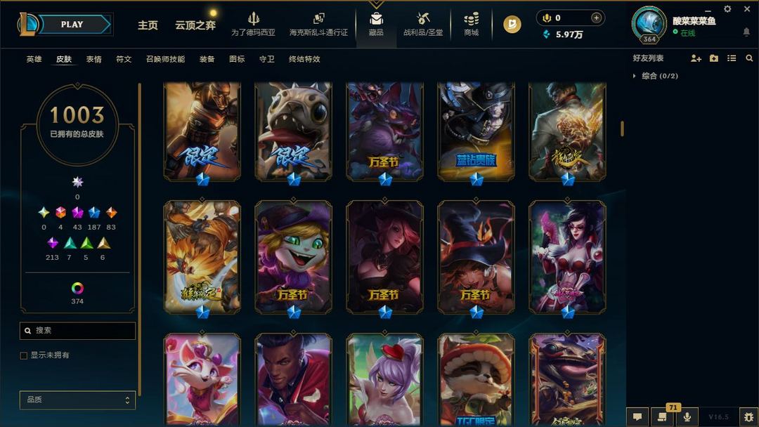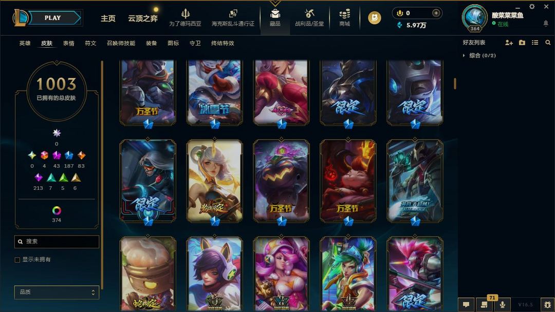 【LOL大王】1400P乄1003原皮乄374炫彩乄35臻彩乄12神话乄149限定乄龙虾乄玉剑男刀