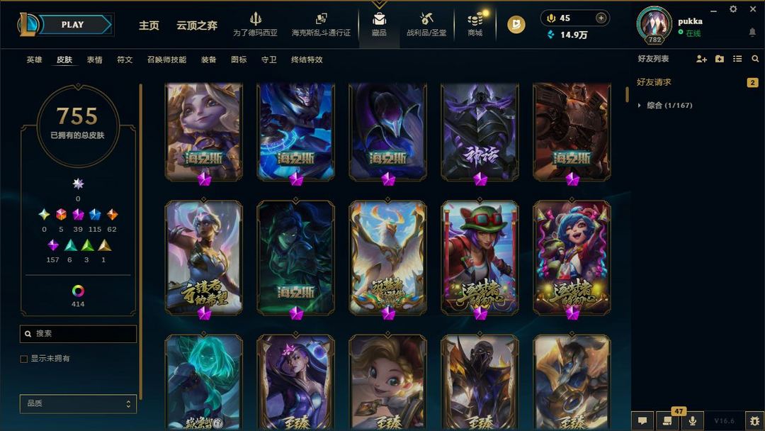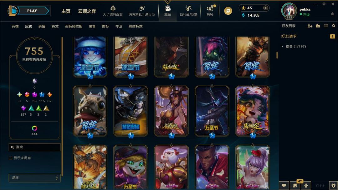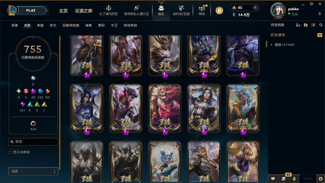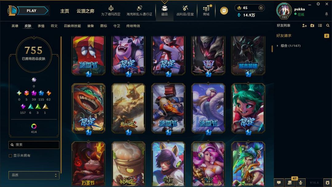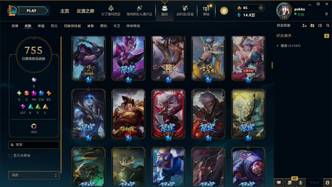 【LOL大王】1200P乄755原皮乄414炫彩乄20臻彩乄40神话乄115限定乄替父从军