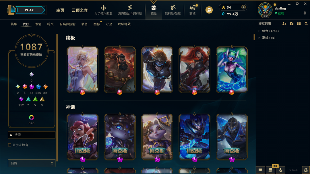 【艾欧尼亚★不可排位】★全皮2000★原皮1087★炫彩931★臻彩神话96★段位更新★真实描述★