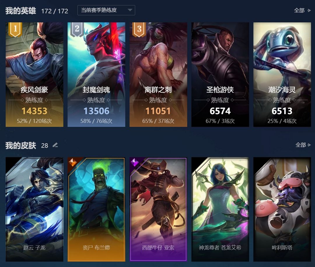 ❤️艾欧尼亚❤️璀璨钻石❤️海克斯乱斗全解锁❤️赵云子龙❤️丧尸火男❤️敲钟牛❤️魔装兰博❤️海克斯