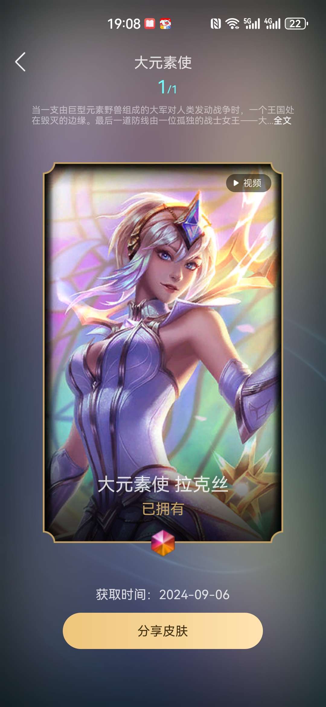 装备描述:大元素使拉克丝,臻彩(螳螂,拉克丝,天使还有记不清了)皎月冰雪节神王盖伦等等,希望各位老板善待我账号。