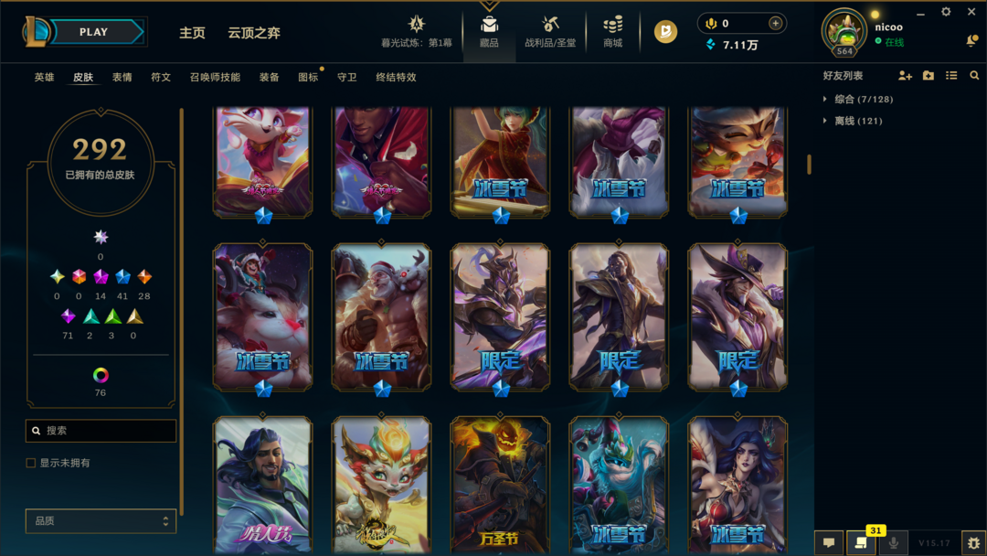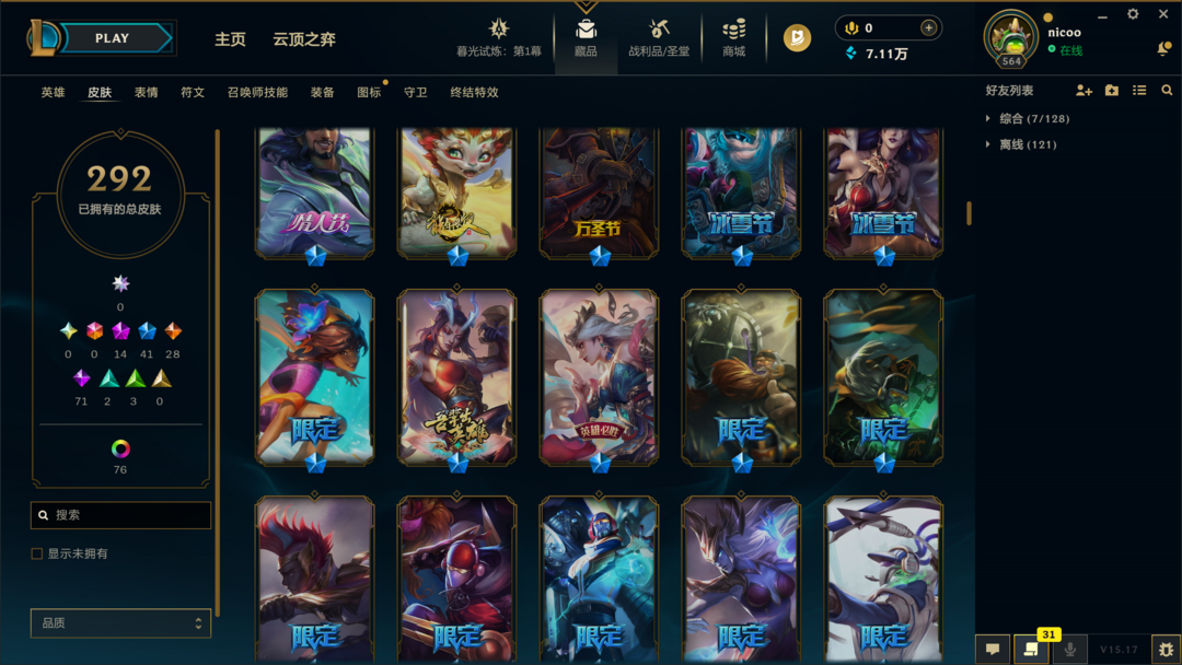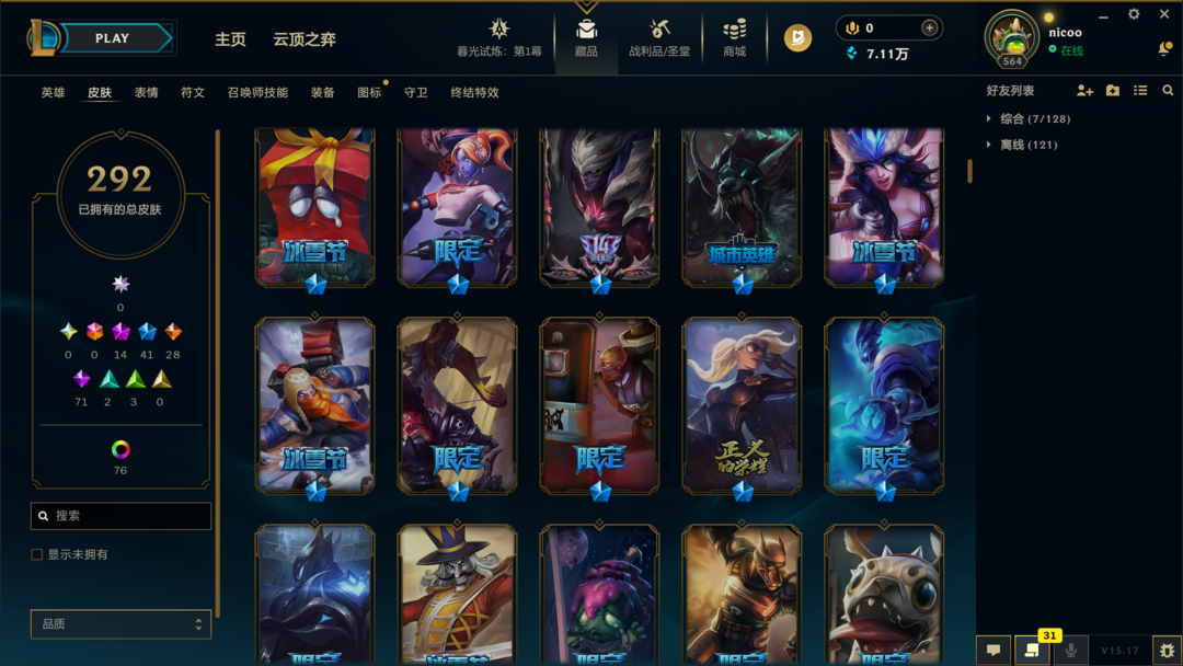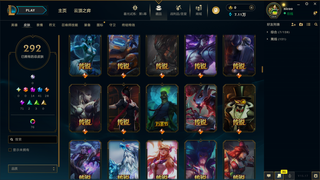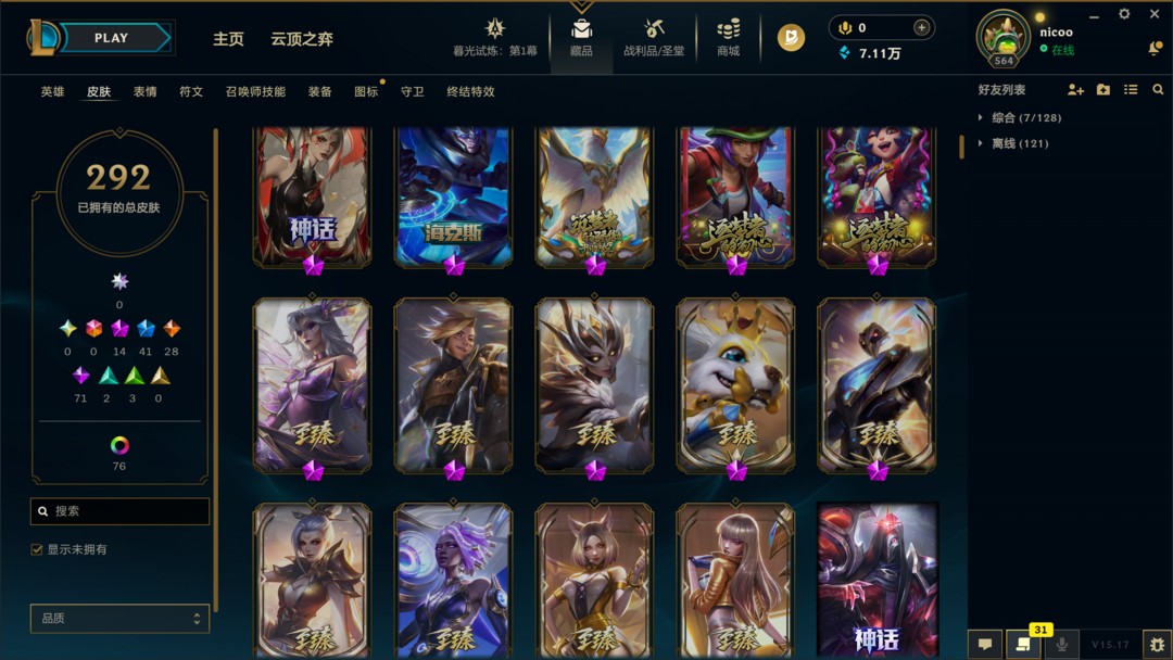 段位准█292皮肤〓20至臻海克斯〓神王女帝〓青花瓷智天高〓灵魂莲花〓
