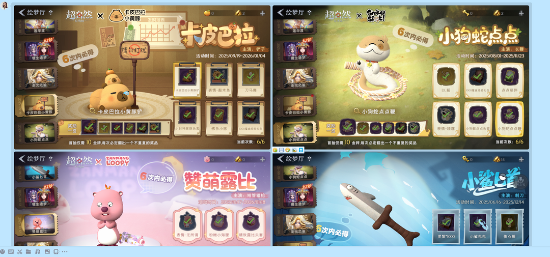 装备描述:[幻梦皮肤]巫铃儿-镜生遗梦 [金色皮肤]零-渡鸦公爵、逍遥-莲华渡、薇薇安-圣光之谕、小黄-遗失的童话、巫铃儿-镜花辞 [紫色皮肤]零-搬开山、薇薇安-仙锋小姐、爱丽丝-甜梦派对、艾伦-绒绒对决、莉莉-莓果陷阱、小黄-异色序曲、阿念-迷途僵宝、莉莉-除妖小师妹、薇薇安-黑月挽歌、阿念-王子与骑士、莉莉-情公主、艾伦-水王子、爱丽丝-冰公主、小黄-罗丽、薇薇安-白光莹、逍遥-泽引山海、阿念-灵昭鹿鸣、爱丽丝-瑞羽衔春、小黄-霓裳踏雪、零-云逸歌、巫铃儿-素影瑶光、爱丽丝-丝缕哀歌、逍遥-绣春逍影、小黄-呱呱雨衣 [道具皮肤]喷气背包-晶澜灵翼、传送按钮-昆仑镜、长鞭-飞天绫、急救包-末章心跳、摸金符-紫霄、铲子-龙鳞、传送按钮-幻宠之门、夜视仪-心跳眼镜、葫芦-伏妖塔、牛能量饮料-珍件节乐莓莓、除颤仪-弦外之音、电击枪-甜蜜泡泡枪、牛能量玉抱丹、腰包-宝剑八、刺刀-紫气东来、刺刀-碧络琅环、符-花落精绝、腰包-月下莲台、长鞭-小狗蛇点点鞭、转轮手枪-新星时代、桃木剑-永眠曲、铲子-赞萌波板糖、传送按钮-逆时审判、桃木剑-凤鸣九天、腰包-惊魂娃娃、桃木剑-绯色遗证、喷气背包-乘溯雪、刺刀
