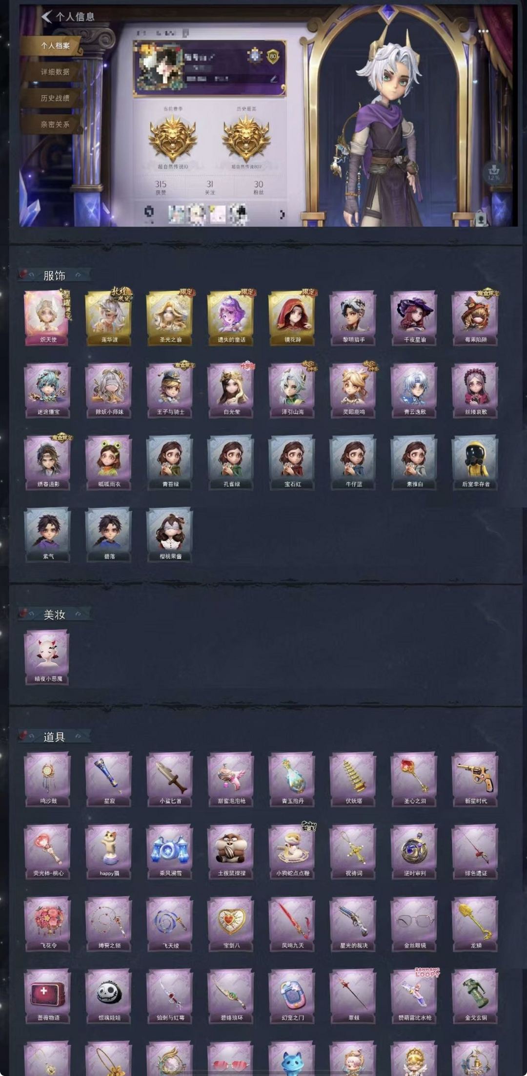 装备描述:【金色皮肤】小黄-炽天使、逍遥-莲华渡、薇薇安-圣光之谕、小黄-遗失的童话、巫铃儿-镜花辞 【紫色皮肤】艾伦-黎明猎手、兰-千夜星谕、莉莉-莓果陷阱、阿念-迷途僵宝、莉莉-除妖小师妹、阿念-王子与骑士、薇薇安-白光莹、逍遥-泽引山海、阿念-灵昭鹿鸣、零-青云逸歌、爱丽丝-丝缕哀歌、逍遥-绣春逍影、小黄-呱呱雨衣 【道具皮肤】音响-鸣沙鼓、专业手电-星寂、刺刀-小鲨匕首、电击枪-甜蜜泡泡枪、黄牛能量饮料-青玉抱丹、葫芦-伏妖塔、铲子-圣心之泪、转轮手枪-新星时代、音响-happy猫、喷气背包-乘风溯雪、急救包-土拨鼠捏捏、长鞭-小狗蛇点点鞭、摸金符-祝祷词、传送按钮-逆时审判、桃木剑-绯色遗证、额外的背包-飞花令、长鞭-缚誓之锁、长鞭-飞天绫、腰包-宝剑八、桃木剑-凤鸣九天、短管猎枪-星光的裁决、夜视仪-金丝眼镜、铲子-龙鳞、急救包-蔷薇物语、腰包-惊魂娃娃、刺刀-铂刺与红萼、刺刀-碧络琅环、传送按钮-幻宠之门、短管猎枪-赞萌露比水枪、闪光弹-金戈玄铜、摸金符-紫霄、摸金符-花落精绝、传送按钮-昆仑镜、夜视仪-心跳眼镜、背饰-潮汐小海兔、背饰-梵音莲华、背饰-天使的呼唤、背饰-蝶恋花、背