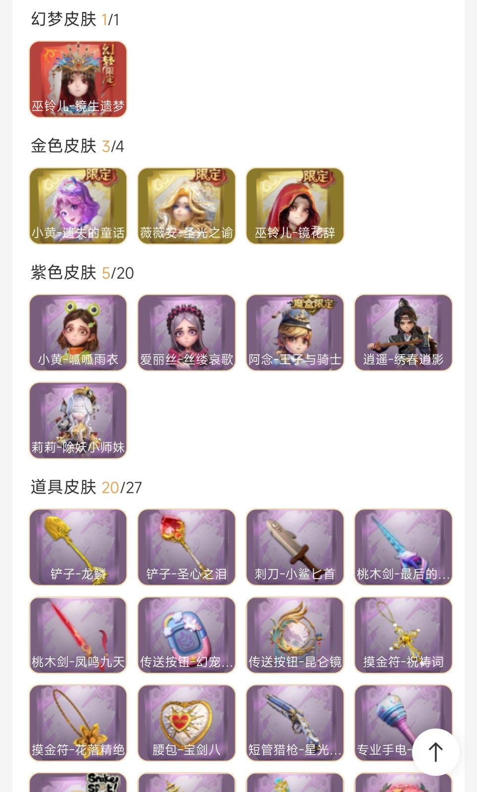 装备描述:【镜生遗梦】巫灵儿镜生遗梦丶1红3金多紫丶薇薇安圣光之逾丶小黄遗失的童话丶超多皮肤道具