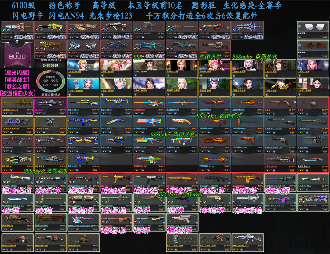 限制: 租号5次及以上 |装备描述:★粉色称号90%武器持有!网通一区等级前十名6000级! ★绝版装饰:天使羽翼(白翅膀) ★特典武器:黯影狙。至尊金鲨鱼。 ★全部武器全6攻6恢复,请您去仓库里自行切换! ★怀旧黑龙炮、怀旧斧头、怀旧电锯、完美+8末日骑士5后3弹、生化感染全赛季武器、十周年武器。 【玩过别忘收藏!!!用心打造极品账号,给您最棒的游戏体验!】