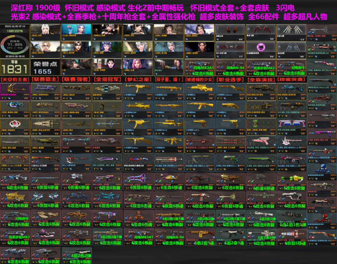 限制: 撤单率<30%才可租用此帐号装备描述:电信二区,深红称,怀旧模式、感染模式及生化Z前中期畅玩。光束123、闪电MK3A1、闪电野牛、AN-94。1700级,天空的王者,千万积分打造顶级配件,所有枪全部双66配件,1-23赛季满(只差4赛季),超凡人物有血魔女、博士、冠军、向导、级长、蓝兔、海灵、狼人等。超多皮肤枪。 A佬出租欢迎你的光临!喜欢请收藏店铺,店铺里下单可领红包。 【已去黑雾,画面优化,画质清晰。【欢迎收藏】