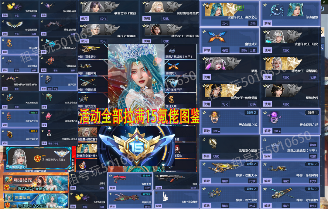 装备描述:15级图鉴【所有活动全部秒氪 欢迎老板经常来玩〖安全模式可帮解除,点上号器的连系号主发安全码 等待会即可〗丨全套装全BOSS角色增伤丨【秘境83关满聚合970秘境满基础伤害,45星风神武,45冰+45风神武两个金色能量再生】【✅新增道具描述✅】:【青鸾引-丹翎流音,游侠-鹤唳穿云先行物】升级版新坐骑赤熔玄翼【涅槃女王+波塞冬女王-潮夕之心,潮夕头饰,冰火金蝰翼,传奇三女王】【天命渊瞳戒,天耀套+神谕套全核心10+10,返利元初双极羽翼】〖最新增伤角色:莱娜 | 天命观吾之戒〗【变身英雄望舒+璃璎丨焦油】【塔防拉满影戍-玄械,四臂铠皮肤,焚霄-玄烬】【最新塔防伴生灵冰灵霜精立 | 蓝羽双姝升级版| 无垢澄心圣盔 | 异变残肢,智慧手枪,雷豹-旋刃射手】【不灭焰甲改+战甲转换器+腾风无尽星河紫战甲】婚纱薇薇安钢管舞动作,时溯之轮戒指,霜霆之怒战盔丨永夜迷航天耀全套皮肤【满配涅槃再临精绝女王,蚀日天蝰坐骑,蛇灵霞帔,永寂守护者】英雄焚霄,璃鸢-金翎,✨至臻夜后✨大魔导-艳后,掘金-赛特,龙曦-凌霜-绫羽拉满(机械双鳄鱼升级)丨荆棘之塔-水族碉堡〗 丨天王-黑武电磁-鹿踏祥