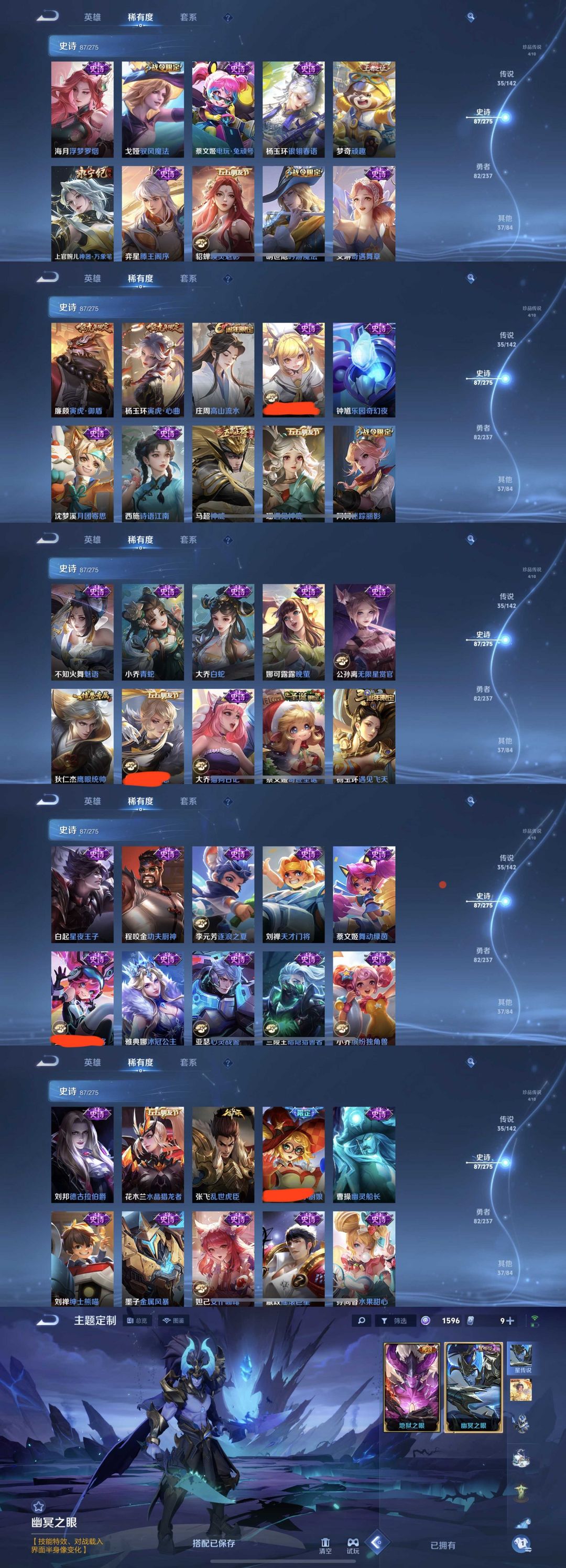 装备描述:时间到了还登录白玩或者顶号全部改密拉黑处理永不解除,顶号机器会秒禁玩改密,顶号不仅拉黑还没得玩,赚三两块不容易,请理解谢谢。 ❤❤❤❤❤❤❤❤❤❤❤❤❤❤❤ 请勿开挂,挂机,送头,骂人,撤单后游戏等如有违规永久拉黑永不解除。 重置二级密码不要费劲了,号主每天都会上号查看,多行不义必自毙,人在做天在看,多做好事多自律,少做缺德事。 该号英雄126个皮肤250个,典藏1个,无双4个,珍品传说4个,星传说1个,传说35个,史诗87个,祝你游戏愉快~