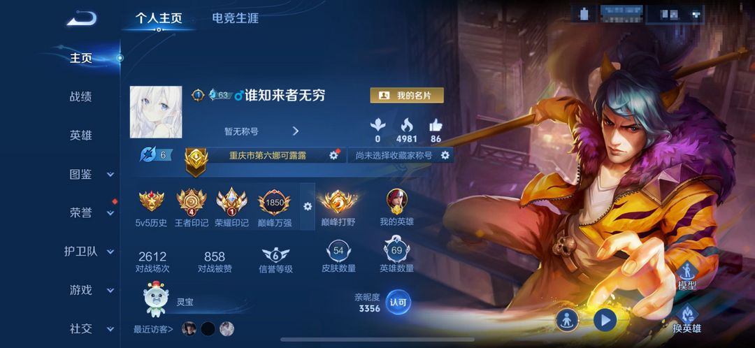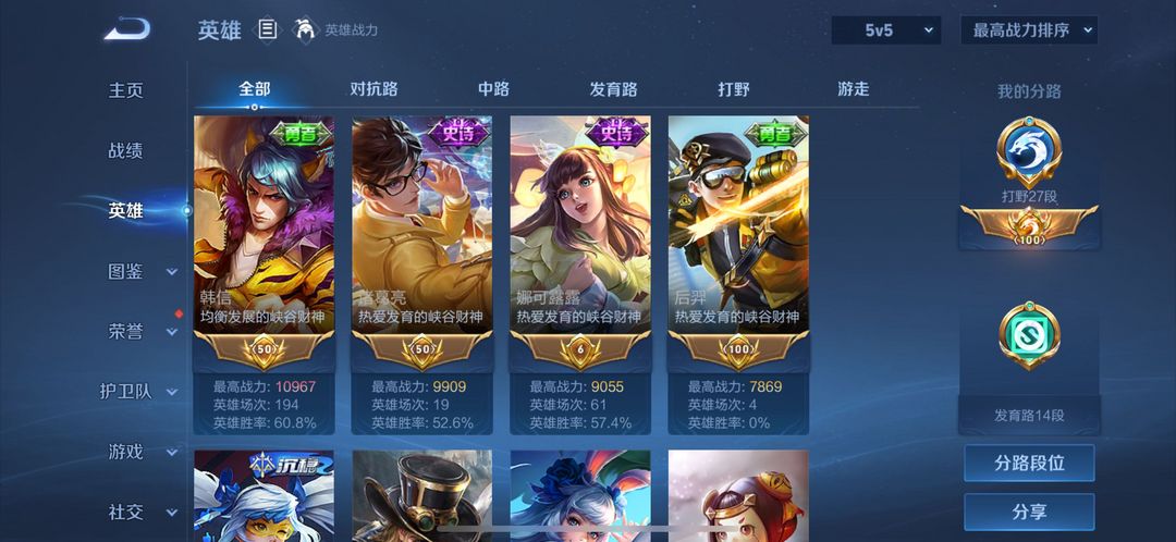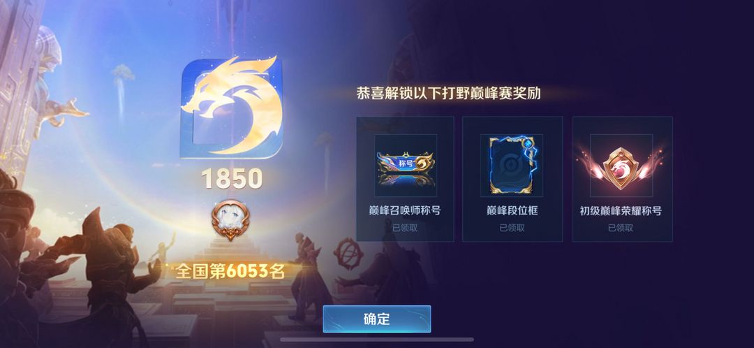 现巅峰万强闪电框在榜打野6053名,在榜省6娜可露露和省27韩信可排位禁打野分路巅峰