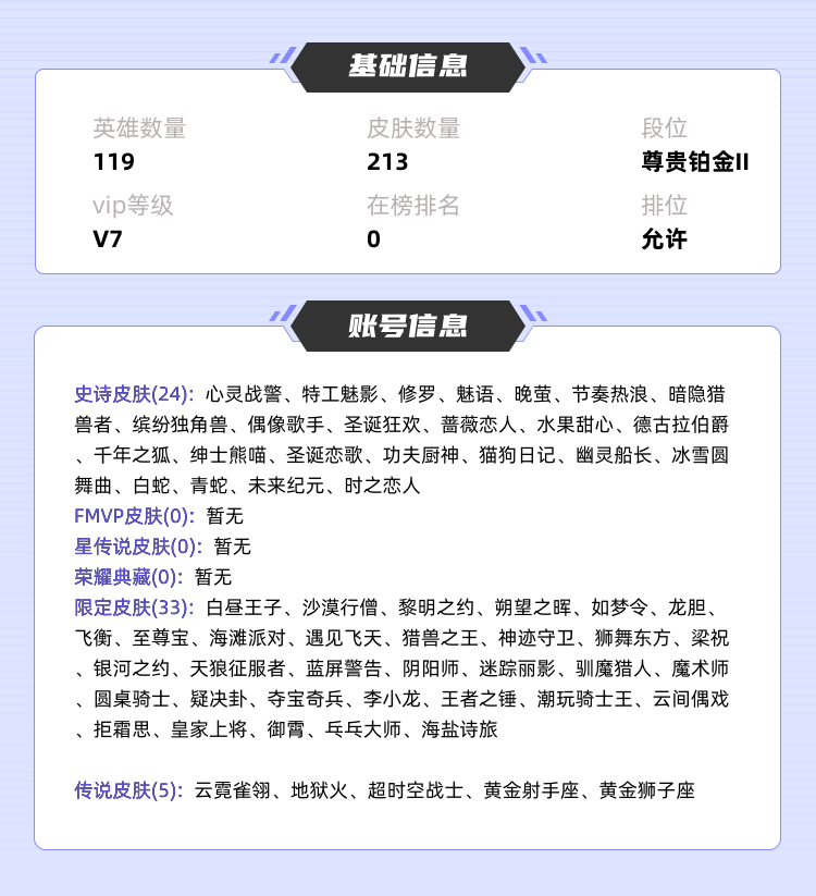 装备描述:毁号,涉及毁坏虚拟财产罪及计算机安全罪,请文明游戏素质游戏,让我们共建美好租号平台 本游戏账号: 英雄多皮肤多。 私人所属英雄皮肤有:达摩 黄金狮子座孙悟空 地狱火狄仁杰 超时空战士后羿 黄金射手座虞姬 云霓雀翎兰陵王 驯魔猎人亚瑟 潮玩骑士王钟无艳 王者之锤鲁班大师 乓乓大师达摩 沙漠行僧杨玉环 遇见飞天阿轲 迷踪丽影上官婉儿 梁祝孙悟空 至尊宝李元芳 银河之约桑启 海盐诗旅明世隐 疑决卦韩信 飞衡嫦娥 如梦令嫦娥 拒霜思狄仁杰 魔术师狄仁杰 阴阳师刘邦 夺宝奇兵米莱狄 御霄典韦 蓝屏警告元歌 云间偶戏项羽 海滩派对赵云 龙胆赵云 皇家上将鲁班七号 狮舞东方女娲 朔望之晖曹操 天狼征服者盾山 圆桌骑士裴擒虎 李小龙雅典娜 黎明之约钟馗 神迹守卫吕布 猎兽之王等等 注意事项: A.游戏过程中请不要恶意挂机或者不文明发言B.恶意挂机、顶号等行为将被拉黑无法再次下单C.进入游戏后中途请勿退出登陆,否则无法再次上号D.