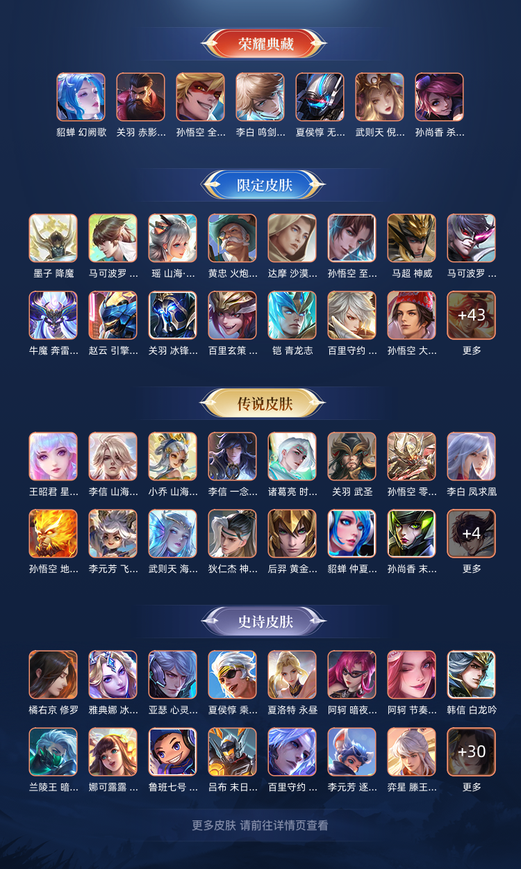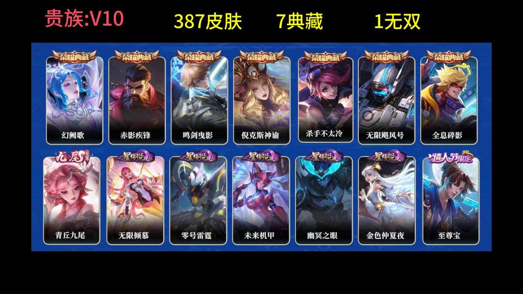 贵族V10丶387皮肤丶7典藏丶至尊宝丶青丘九尾丶无限飓风号丶倪克斯神谕丶赤影疾锋丶鸣剑曳影丶幻阙歌