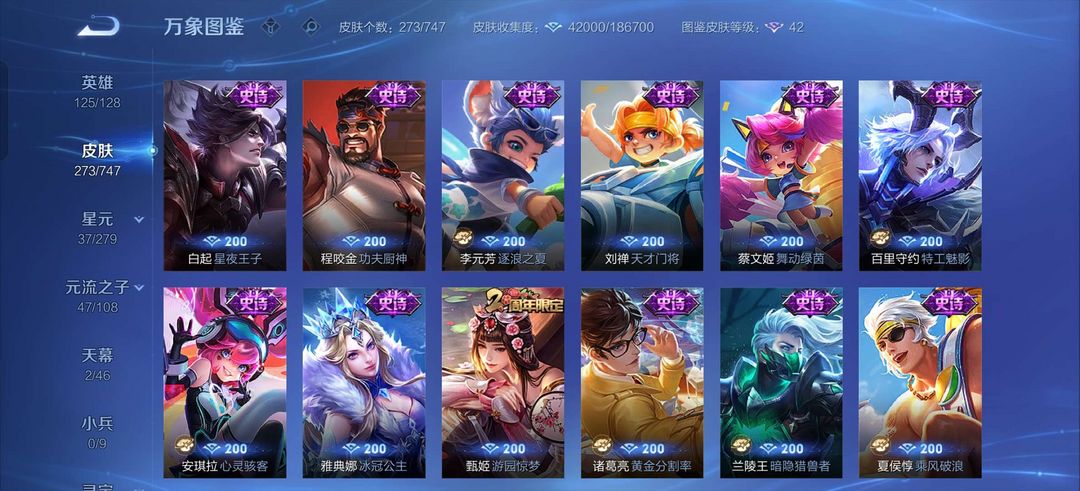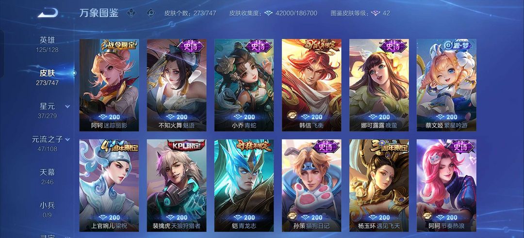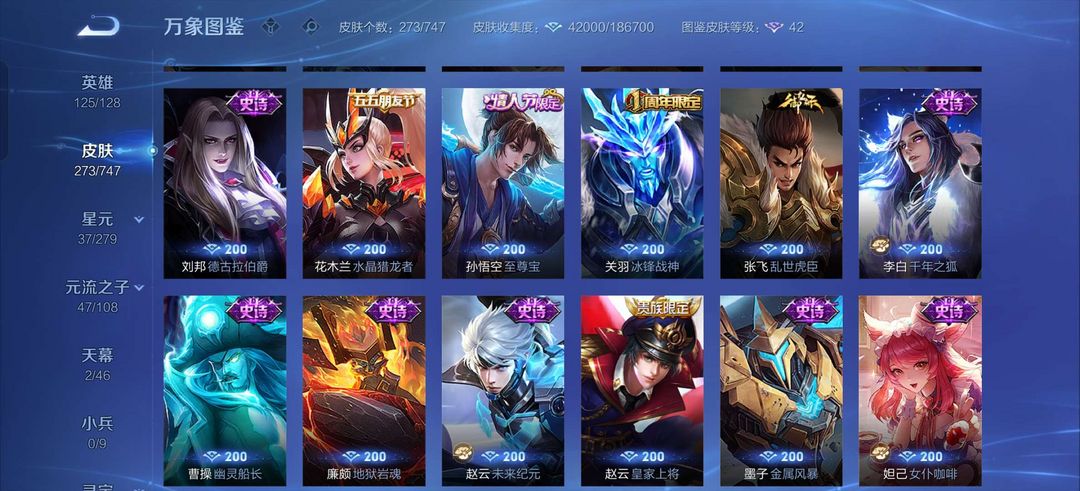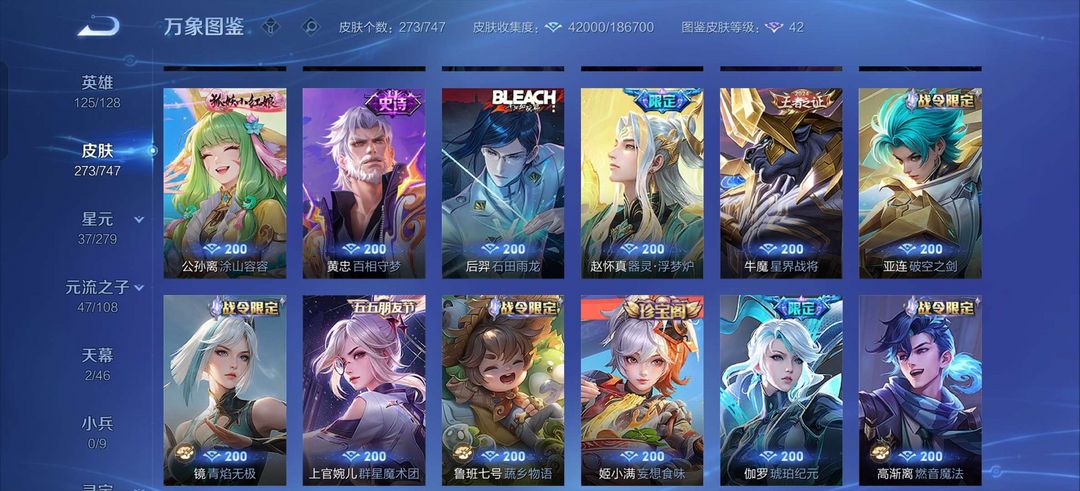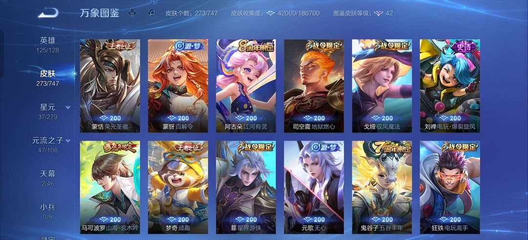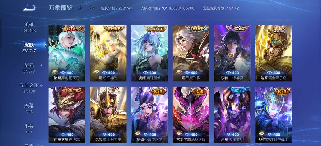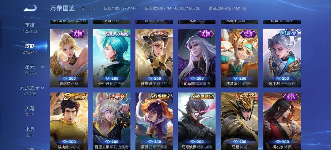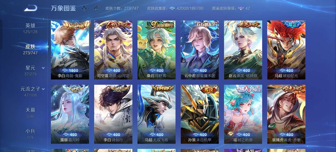 吕布荣耀典藏,李白鸣剑曳影,白虎志,至尊宝,马超差一个战令皮全皮,金色仲夏夜,司空震年限,露娜霜月吟