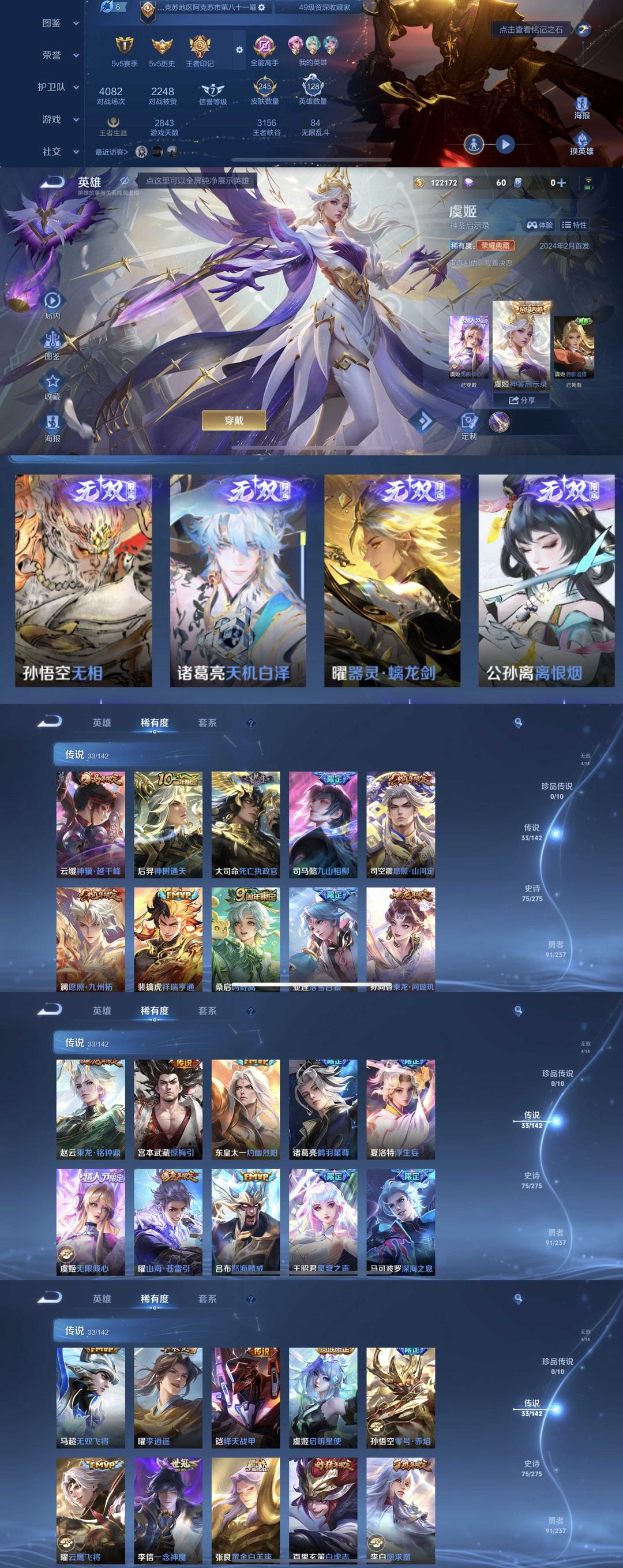 限制: 撤单率<49%才可租用此帐号装备描述:到时间不下拉黑处理永不解除,顶号机器会秒禁玩改密,顶号不仅拉黑还没得玩,赚三两块不容易,请理解谢谢。 ❤❤❤❤❤❤❤❤❤❤❤❤❤❤❤❤❤❤ 请勿开挂,挂机,送头,骂人,撤单后游戏等如有违规永久拉黑永不解除。 重置二级密码不要费劲了,号主每天都会上号查看,多行不义必自毙,人在做天在看,多做好事多自律,少做缺德事。 该号英雄128个皮肤245个,典藏1个,无双4个,星传说2个,传说33个,史诗75个,祝你游戏愉快~