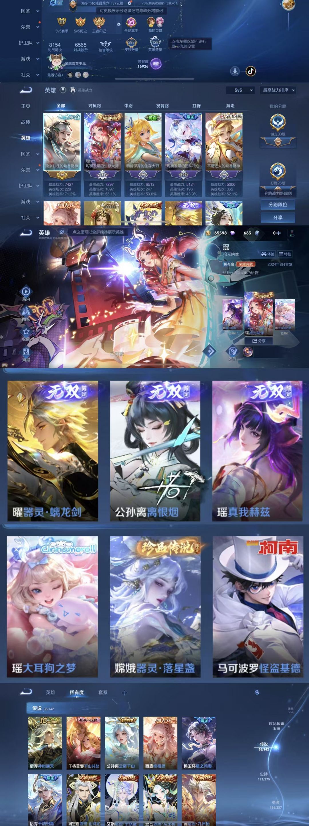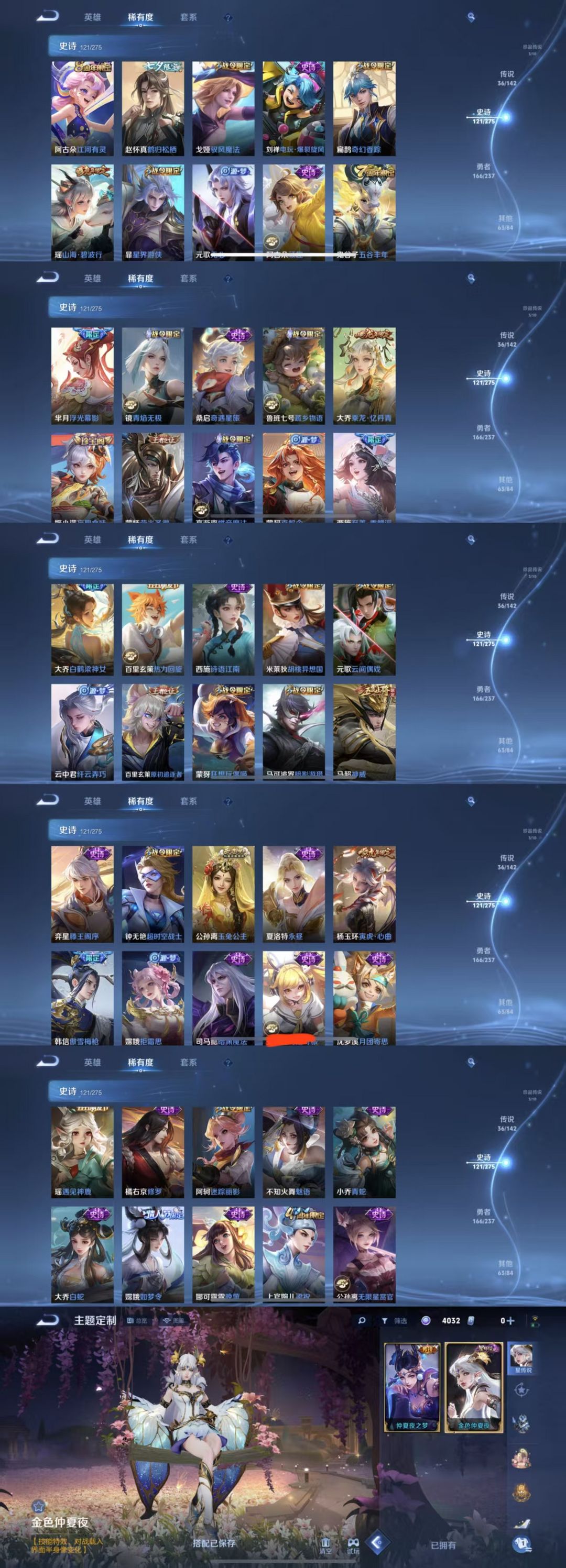 装备描述:该号英雄128个皮肤393个,典藏1个,无双3个,珍品传说3个,星传说1个,传说36个,史诗121个,祝你游戏愉快~