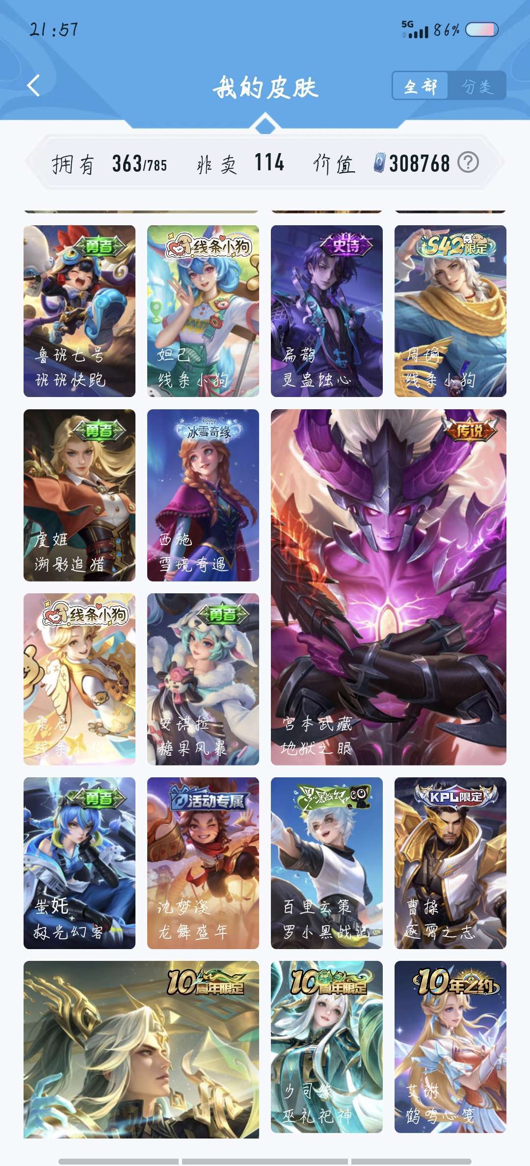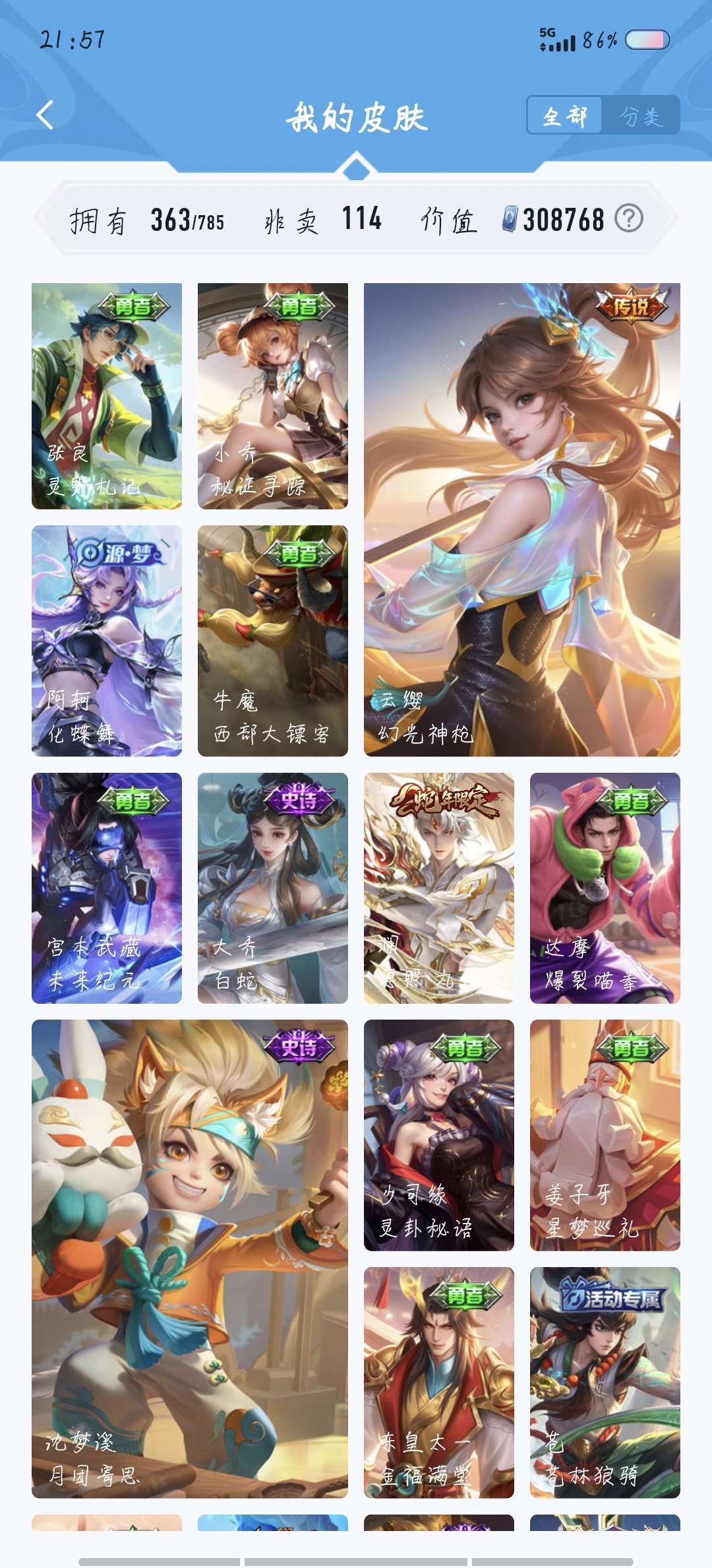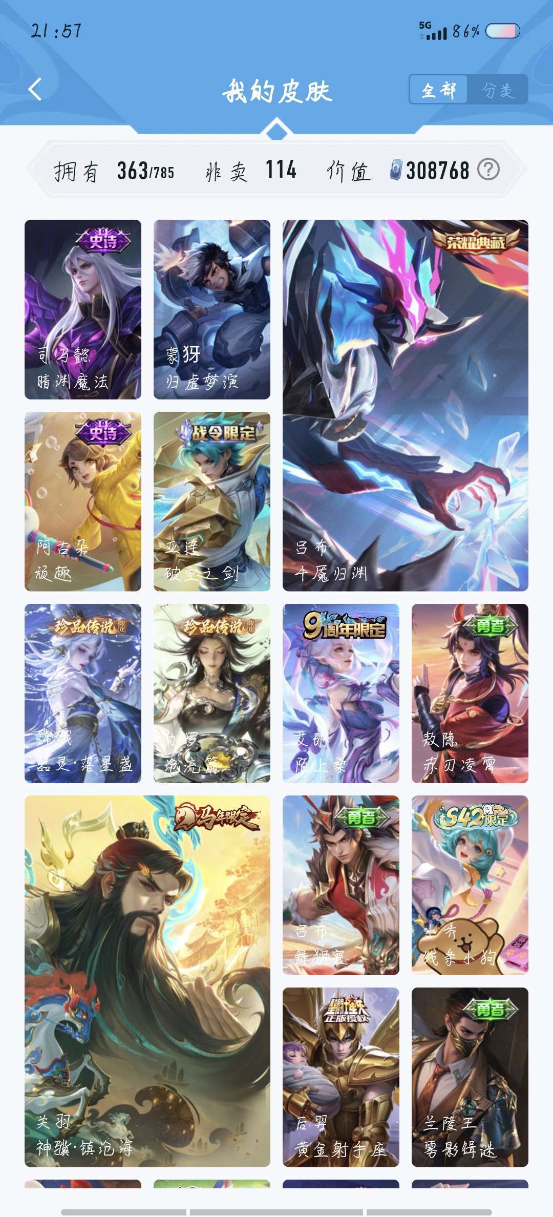 安卓V9·363皮|3荣耀典藏|2珍品传说|117限定21传说|都是热门皮肤 可排位安全号