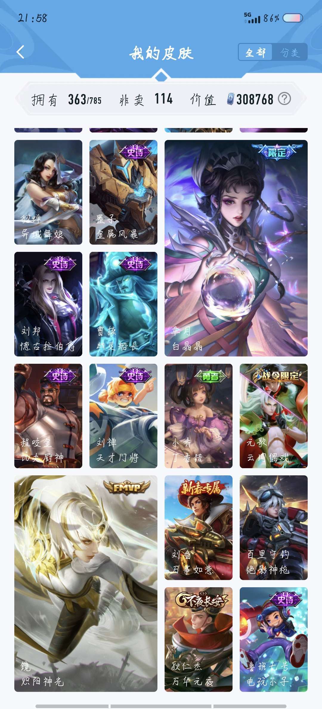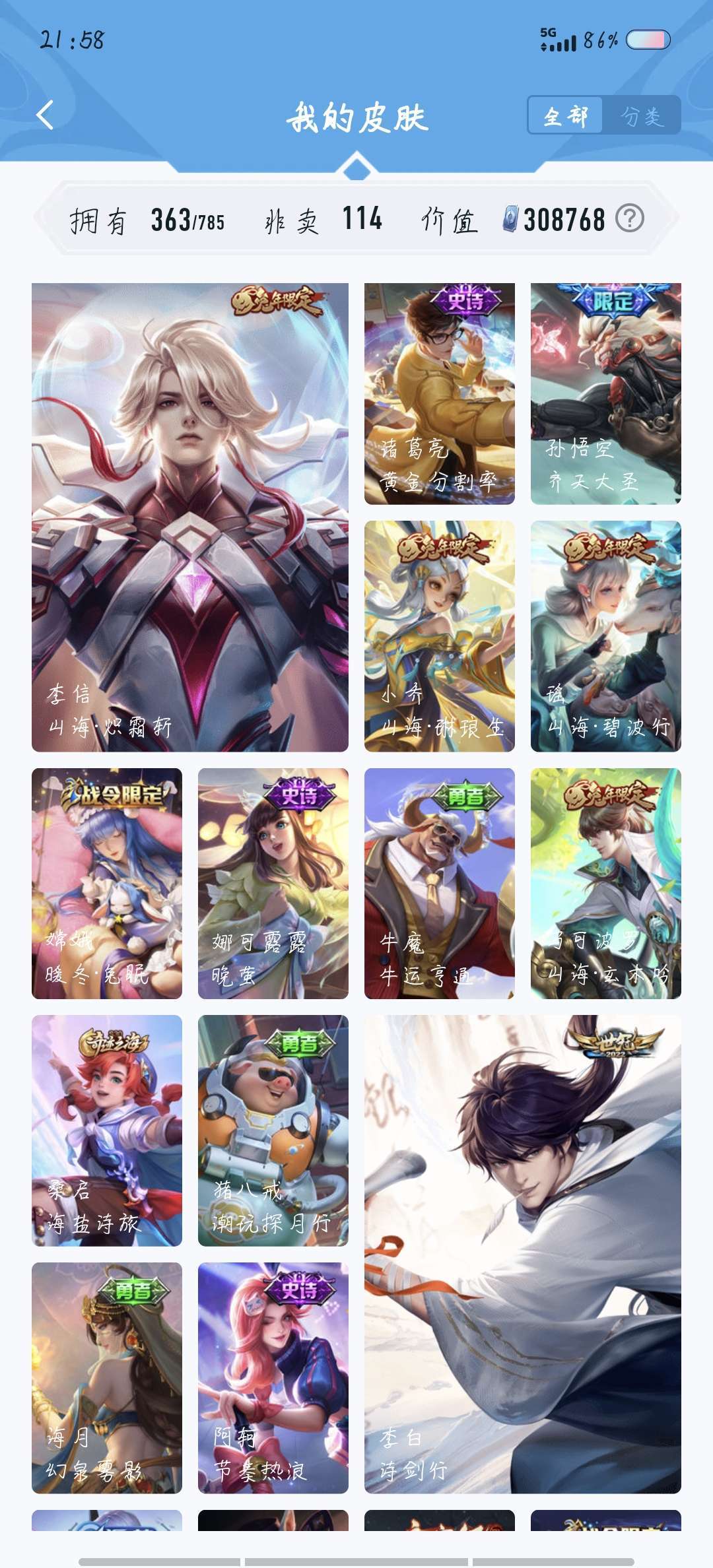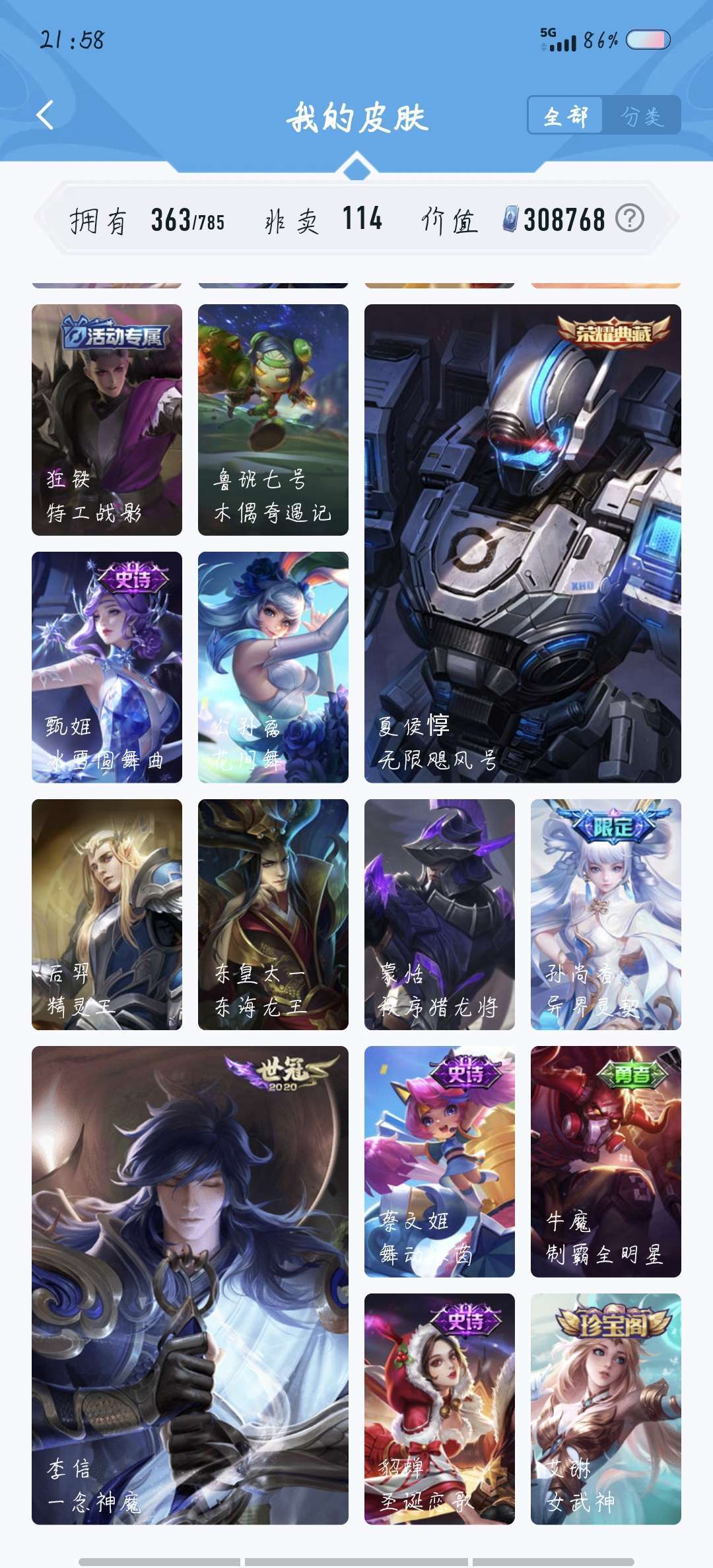 安卓V9·363皮|3荣耀典藏|2珍品传说|117限定21传说|都是热门皮肤 可排位安全号