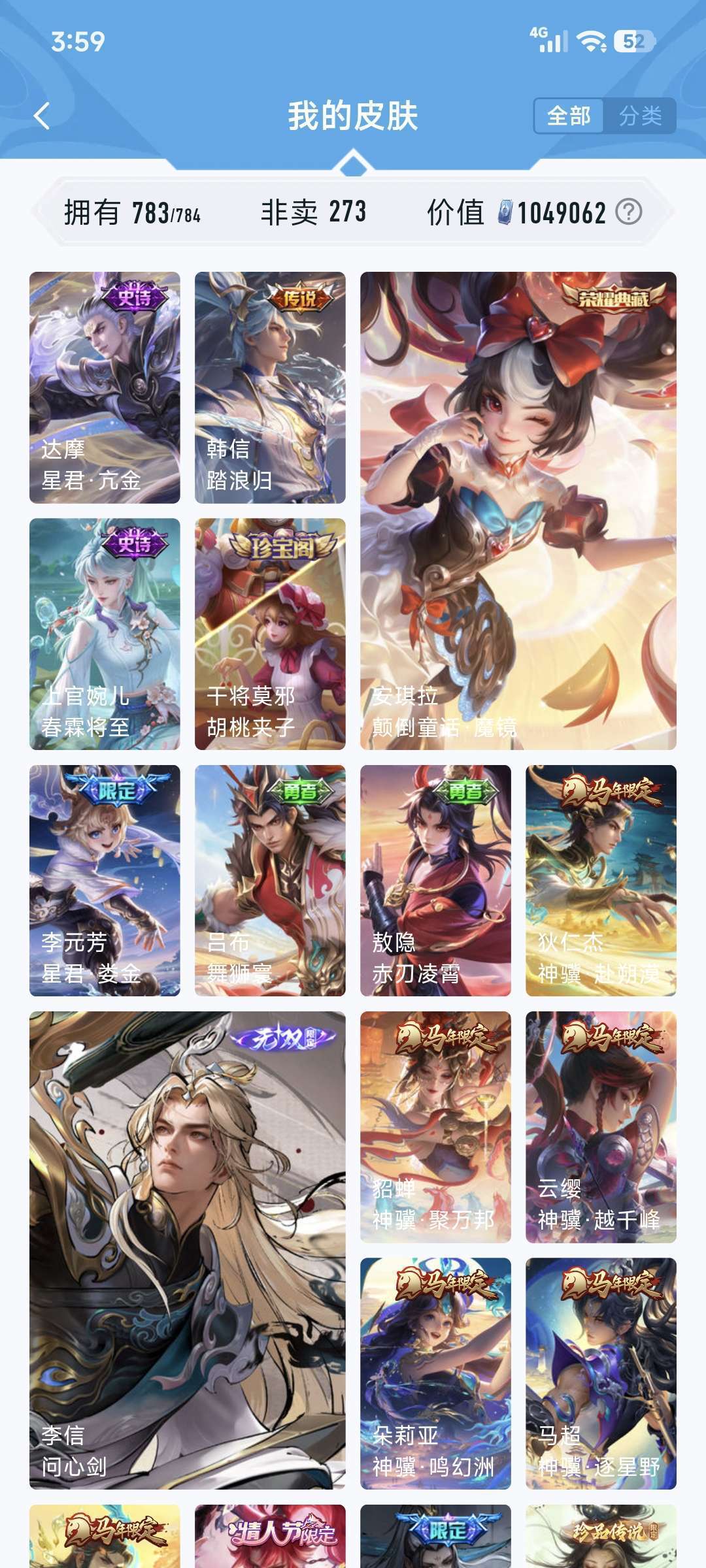 783全满皮肤号❤️全满荣耀典藏无双限定❤️韩信踏浪归❤️问心剑李信无双限定❤️全套马年限定