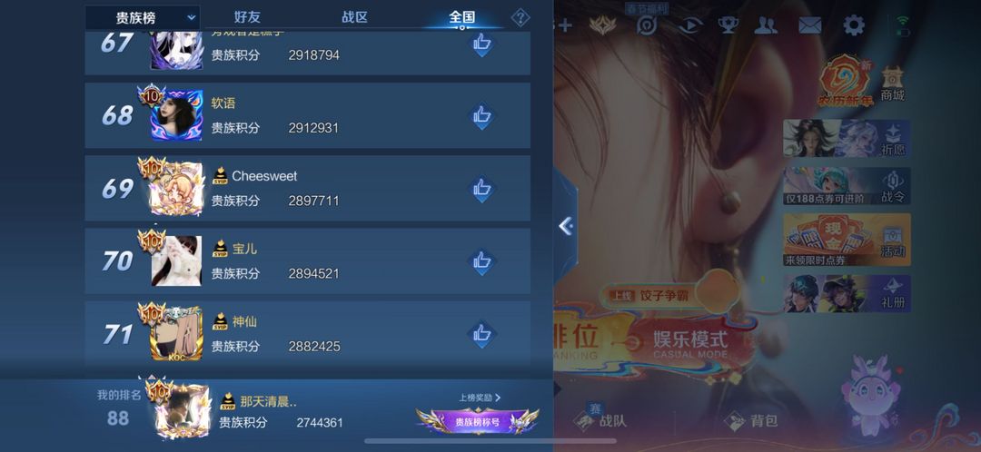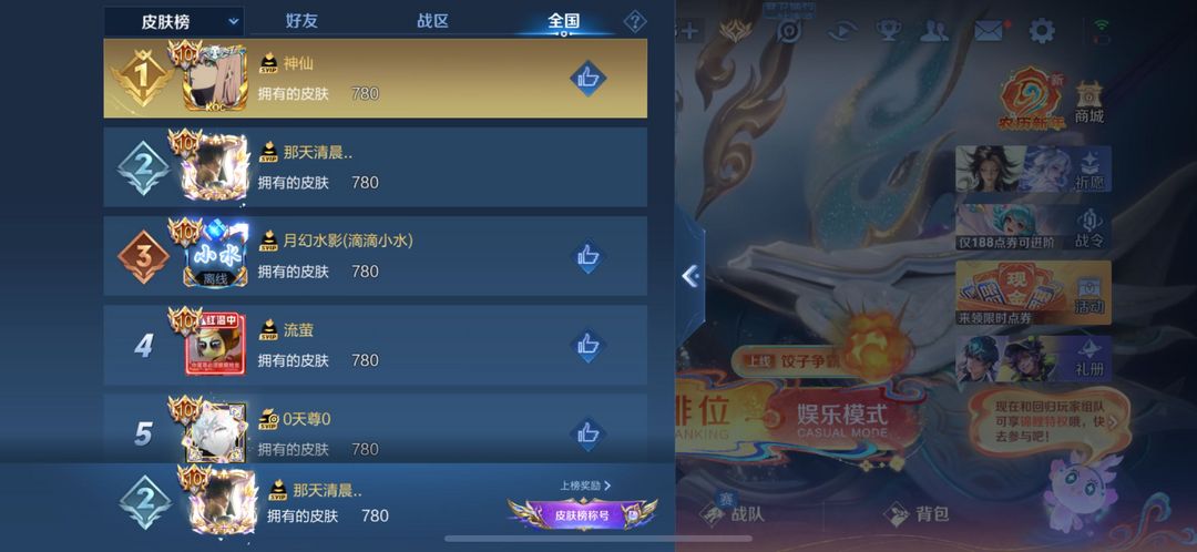 全国皮肤榜第二贵族榜第88❤️满传说播报满典藏满无双满按键满星传满天幕满小兵小兵带排名泉水有复活特效