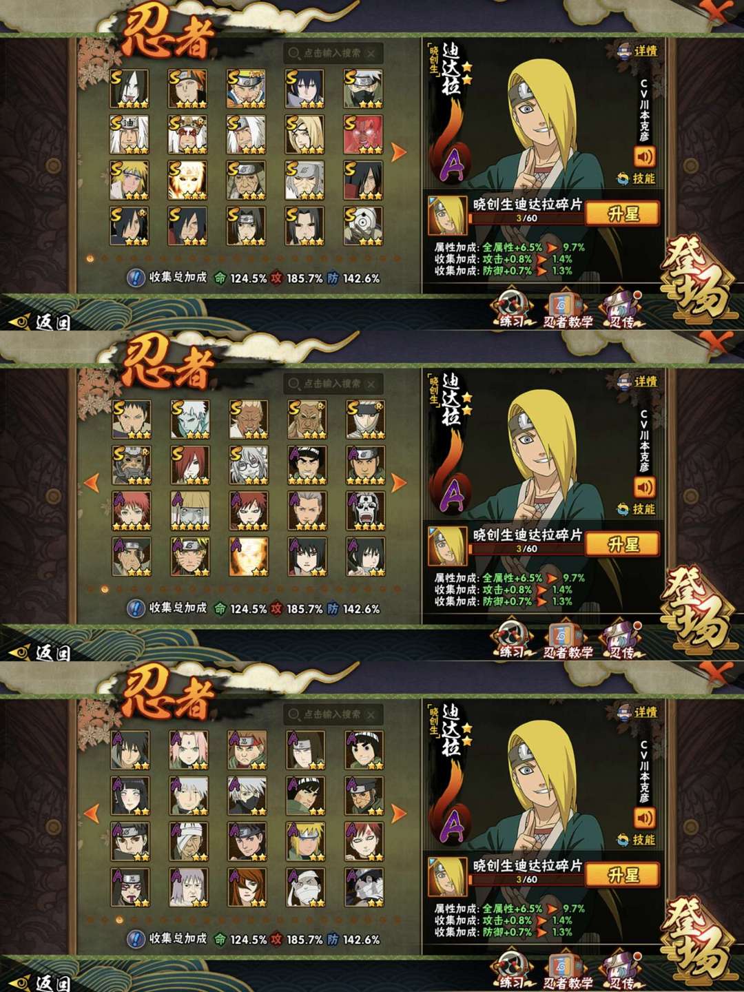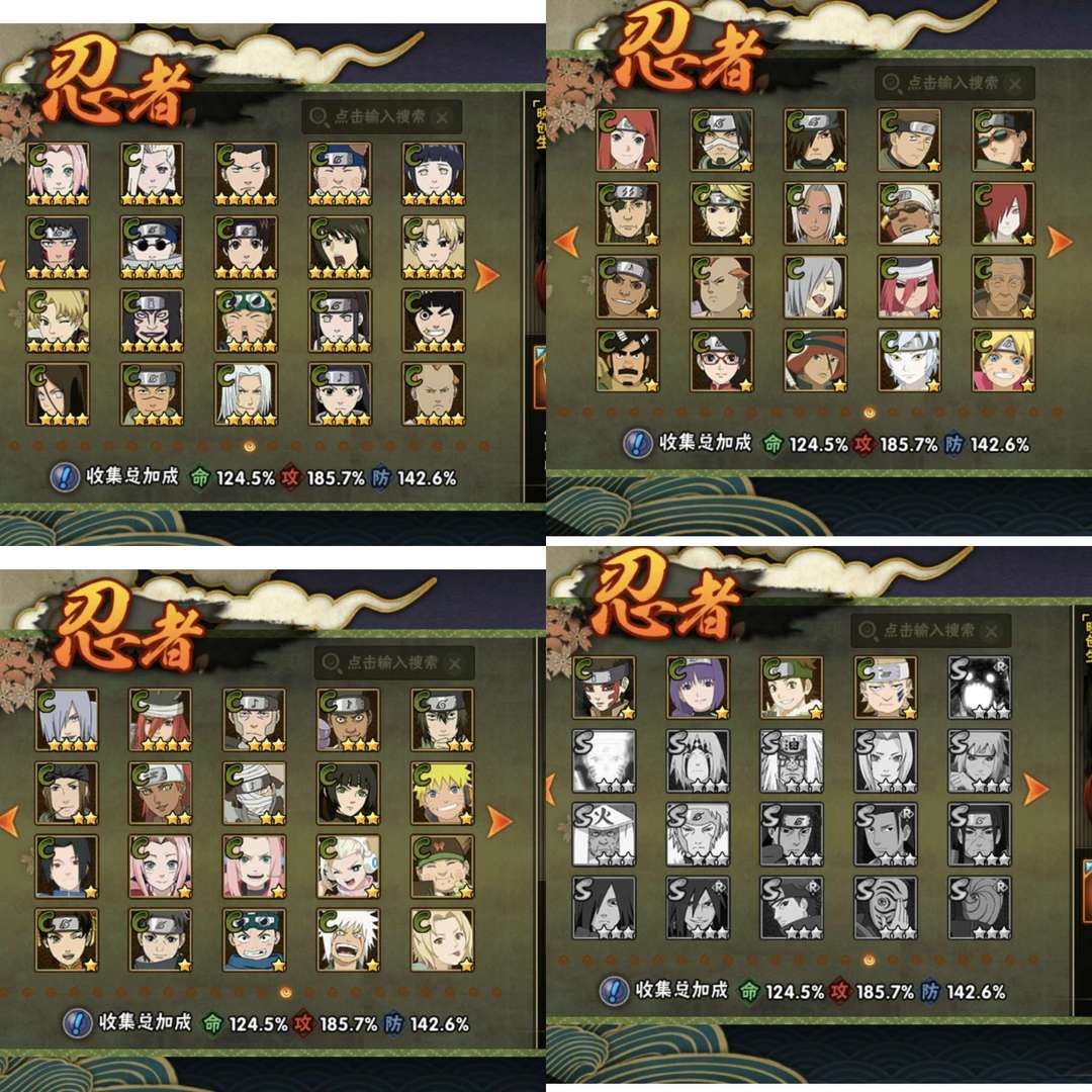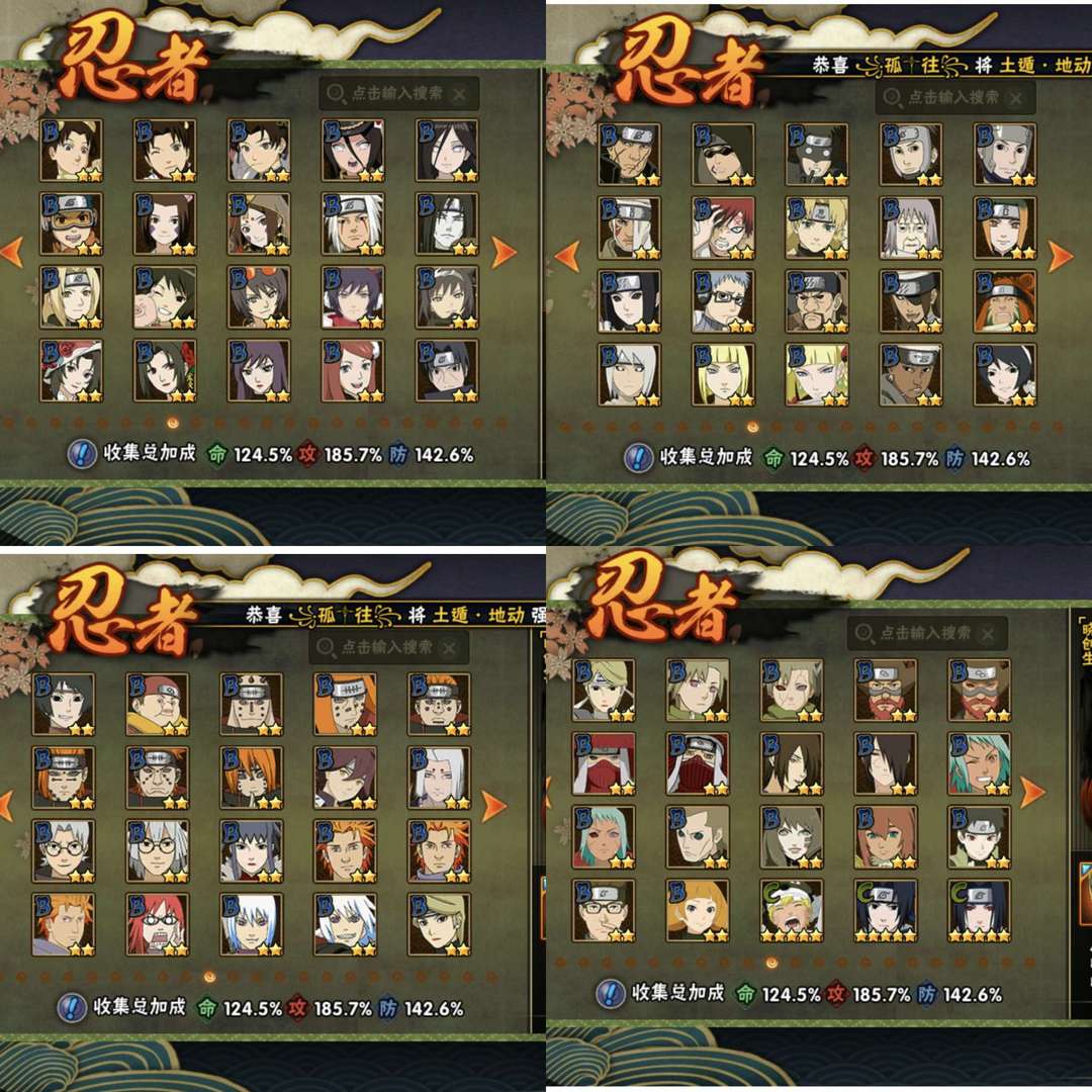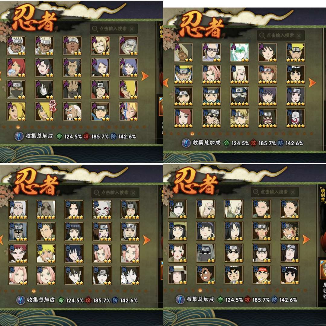 装备描述:仙人巳月,妖怪纲手,阴九尾水门,须佐卡卡西,破面带土,漂泊再不斩,自来也,百豪纲手,传说自来也,秽土二代,解斑,永恒佐,死门凯,秽土鼬,秽土长门,秽土三代,忍战雷,鹰佐,骨架,青水…多数高招A千万战力有熊猫