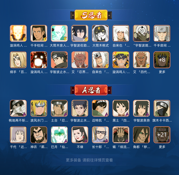 装备描述:一千四百万战力✨25s✨37a✨漂泊带土✨小南✨新春止水✨卑留乎✨忍战卡✨侠影佐助✨妖怪纲手 不是违规就是过于简单找茬呢