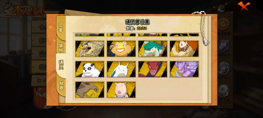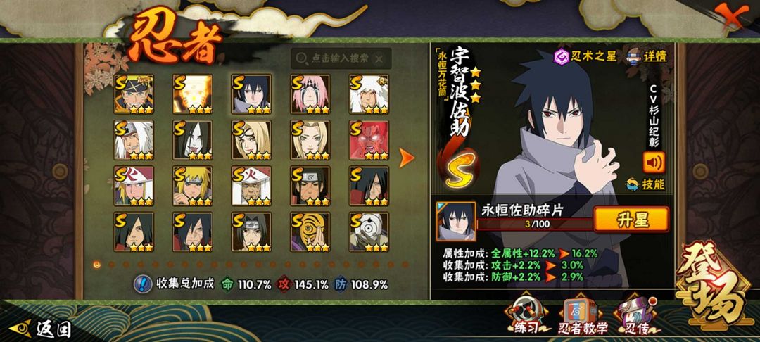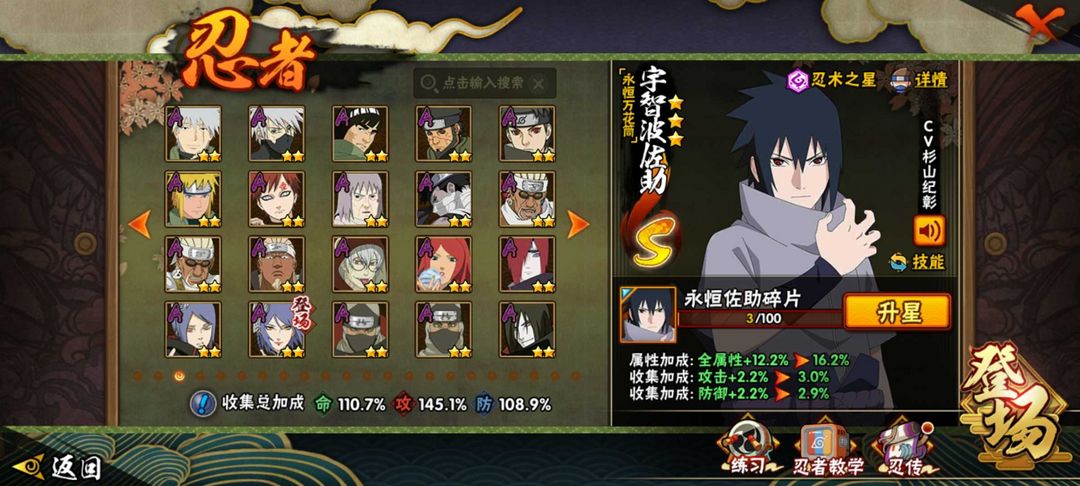 装备描述:熊猫蛞蝓,宇智波带土,宇智波斑,须佐佐助,九喇叭鸣人,白面具,暴怒小孩,忍战雷影,死门凯