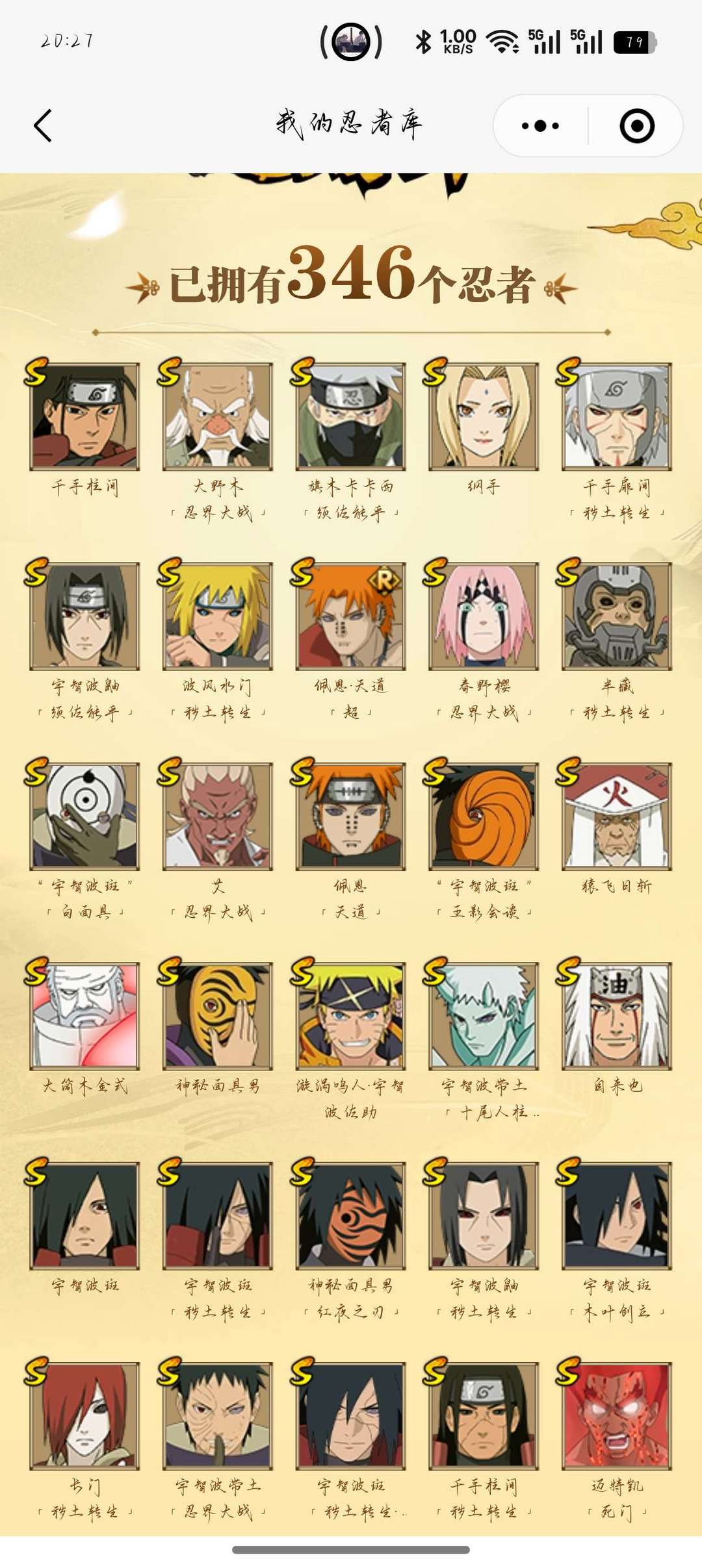 装备描述:神驹阿斯玛,飘带,十带,忍战带土,熊猫,12个忍法帖忍者一共346个忍者,九尾鸣人,永恒佐助,小樱,漂泊侠隐系列忍者