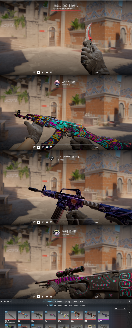 装备描述:完美老兵丶折叠刀自动化丶ak47夜愿丶awp迷人眼丶丶m4活色生香丶m4a1黑莲花丶超多主战多皮肤