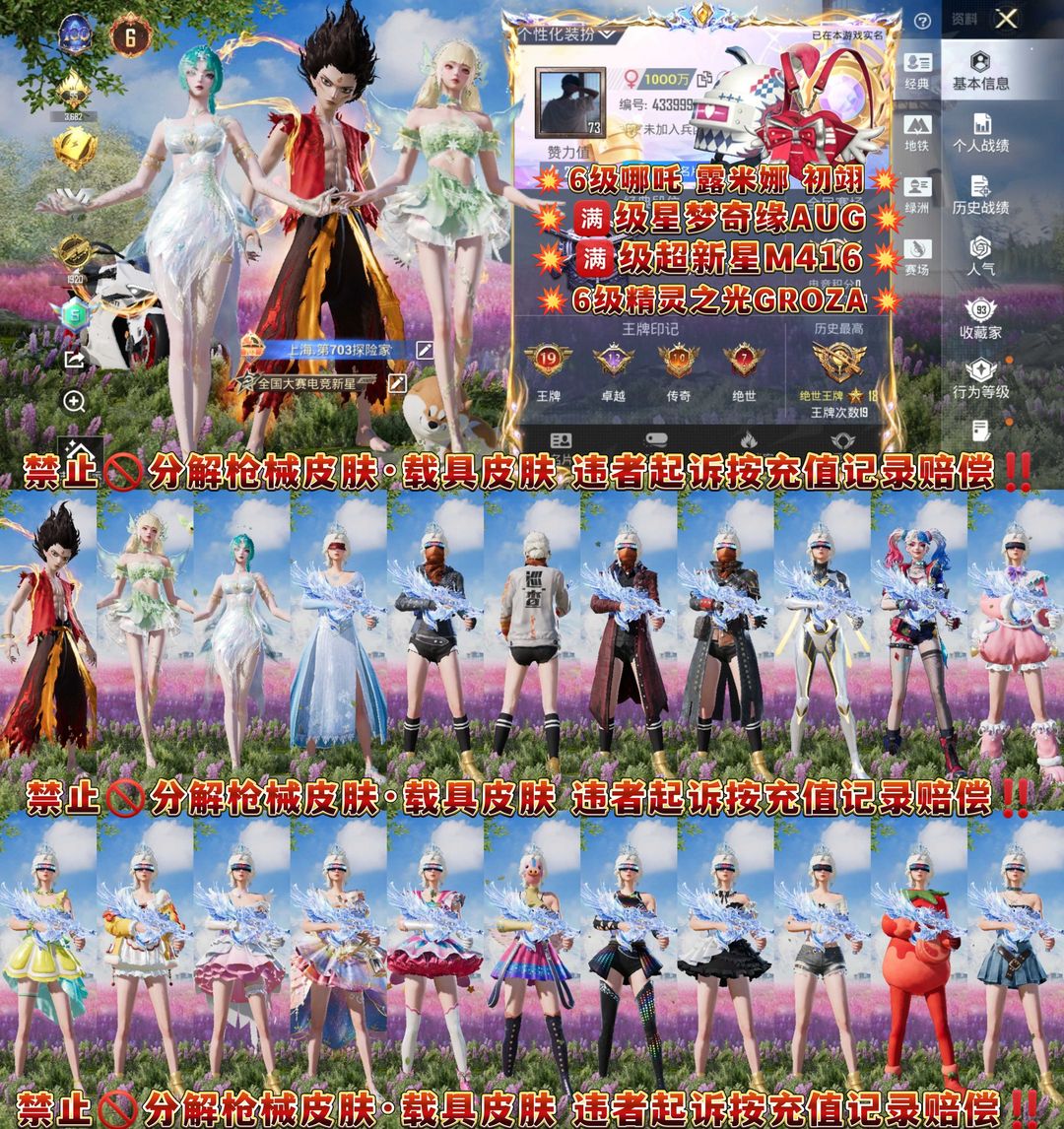 限制: 租号18次及以上 |装备描述:特别声明!!!! 分解载具枪械永久拉黑不解除 【乱投诉拉黑】和平号有问题/上不去/其他问题/ 特殊需求/投诉没用等问题 账号累计充值超10万!切勿开挂/分解装备/恶意骂人/等等违规行为,发现违规必追查到底(平台登录记录,游戏登录ip手机号 设备串号 充值付款记录不要侥幸现在网警都能调到你的所有行为记录就算盗用他人信息也一样能查到你头上)按账号充值金额=起诉/刑事立案/追责赔偿! 非速玩【非云!本机设备畅玩不卡顿】