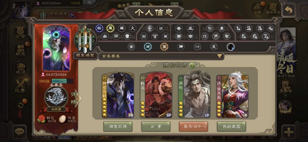 装备描述:动神司马懿 动麹义 周处 谋黄月英 王粲 陈琳 界李儒 花鬘