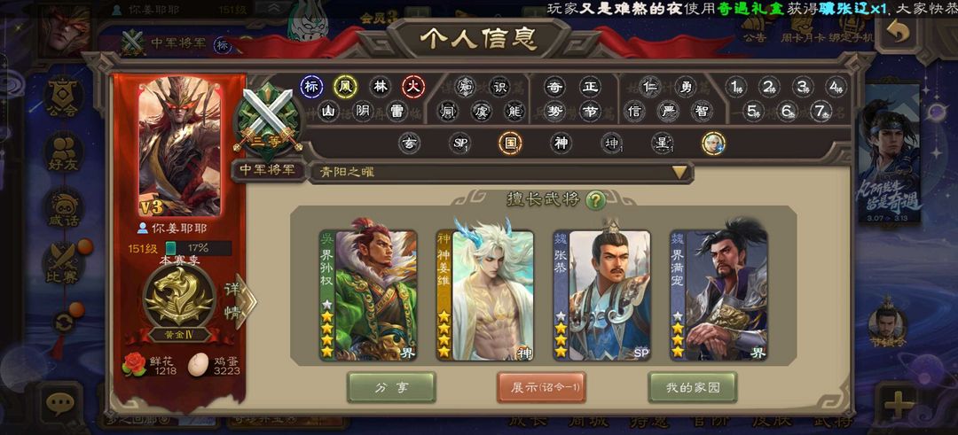 限制: 租号4次及以上 | 撤单率<15%才可租用此帐号装备描述:【有三卡】神姜维新武将尝鲜,新武将神姜维