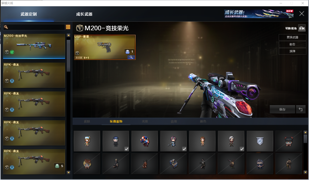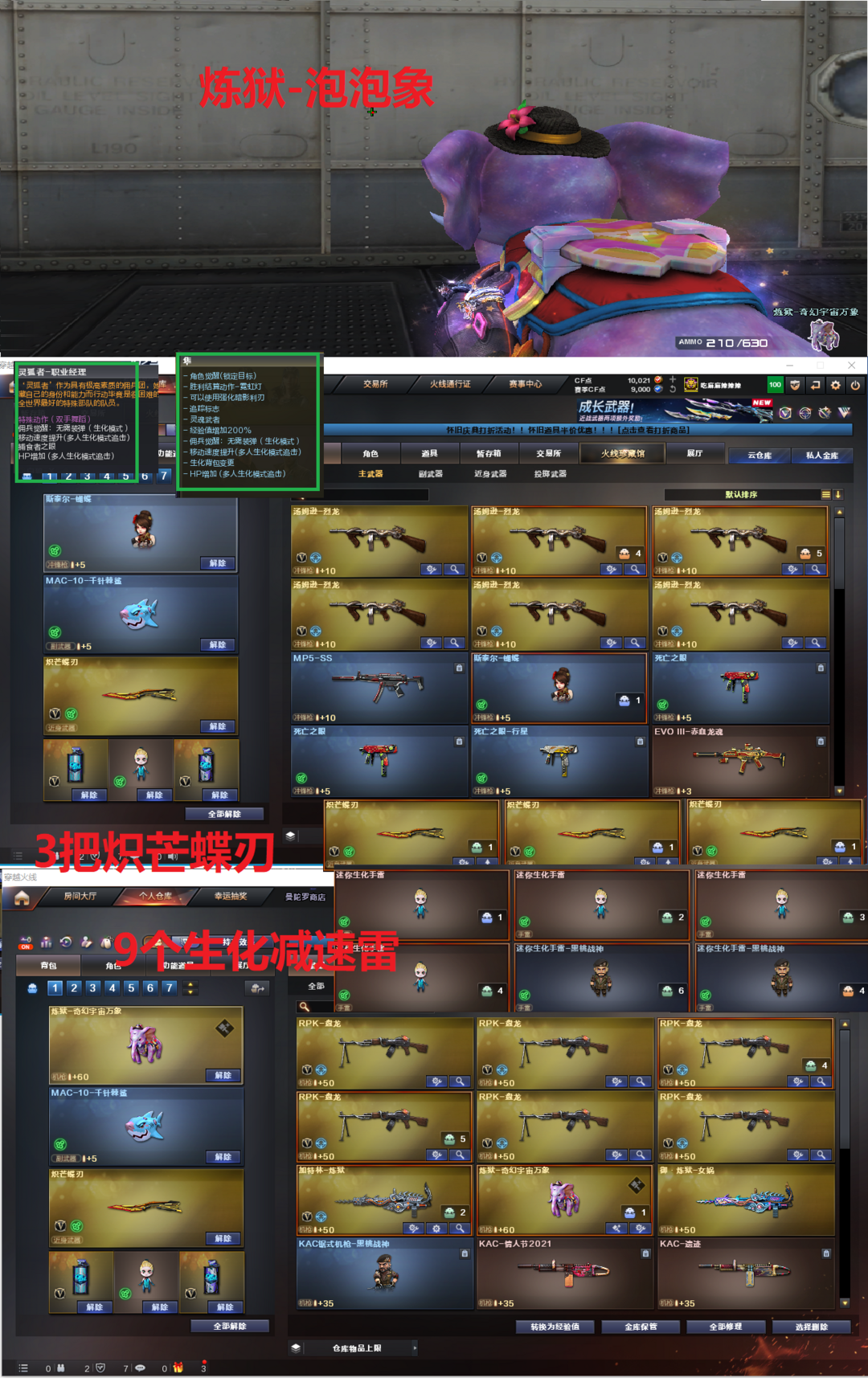 装备描述:排位:可以、、、、、、、生化四防全装(可以变更背包、查看生化僵尸血量):无需换弹、6烈龙、6盘龙、炼狱、炼狱-泡泡象、斯太尔蝴蝶、死亡之眼、MAC千针棘鲨、3把炽芒蝶刃、手斧镜、超级对讲机、、、、、、、、爆破四防:幻神竞技荣光、USP雷暴、白虎玄豹、王者玄武、、、3套雷暴、1套幻灵、2套竞技荣光、、、生化四防(隼、职业经理)爆破四防(云悠悠)