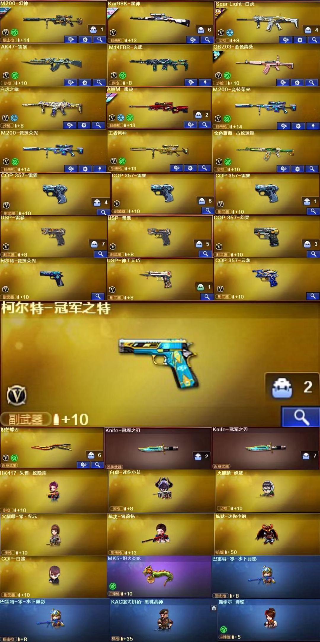 限制: 租号3次及以上 |装备描述:王者武器:王者之灵-觉醒版;王者之锋-觉醒版;超新星-悦享-觉醒版;QBZ-03-王者蔷薇-觉醒版;王者之光-觉醒版;王者之刺-觉醒版;炼狱-悦蓝-觉醒版;王者之势-觉醒版;炫金毁灭;炫金千变;王者之魄-觉醒版;炫金修罗;炫金天龙;炫金火麒麟;玫瑰精灵-悦动 英雄武器:高爆手雷-玄豹;闪光弹-玄豹;烟雾弹-玄豹;机械迷城-穹宇;AA-12-雷霆;雷霆之契;M200-幻神;龙啸-热带奇洋;超新星-热带奇洋;手雷-热带奇洋;AK12-天启;闪光弹-云龙;COP 357-云龙;炽芒蝶刃;M14EBR-玄武;高爆手雷-幻灵;M4A1-幻灵;幻灵之锋;烟雾弹-幻灵;闪光弹-幻灵;COP 357-幻灵;烈火-动感闪耀;天神-动感闪耀;屠龙-动感闪耀;手雷-动感闪耀;Barrett-朱雀;USP-神工天巧;唐刀-神工天巧;烟雾弹-神工天巧;高爆手雷-神工天巧;闪光弹-神工天巧;无影-神兵利器;沙鹰-修罗;柯尔特-冠军之特;M4A1-黑骑士;Scar Light-白虎;闪光弹-竞技荣光;USP-雷暴;烟雾弹-竞技荣光;柯尔特-竞技荣光;M200-竞技荣光;擎天-竞技荣光;高爆手雷-竞技荣光;高爆手雷-